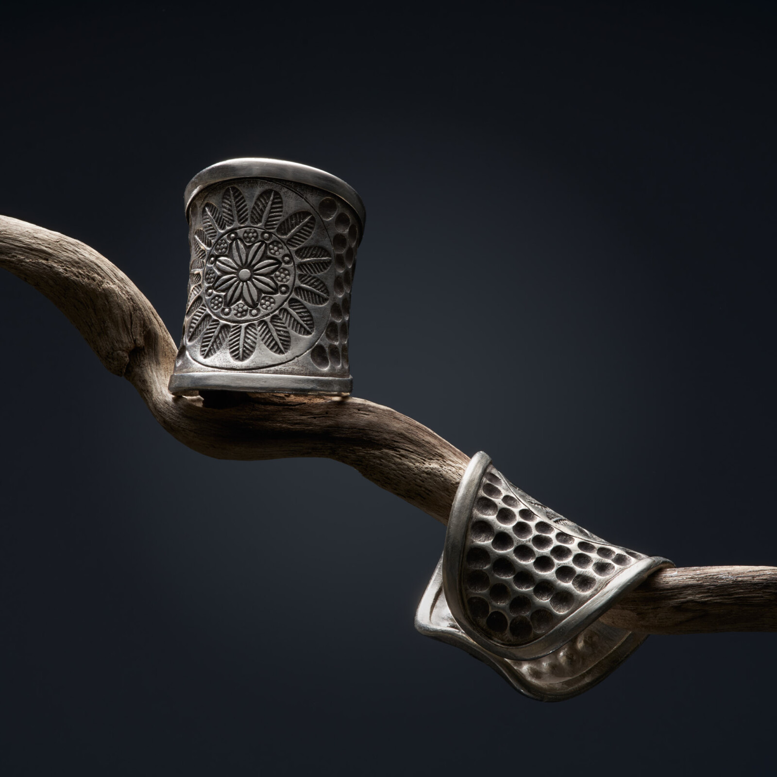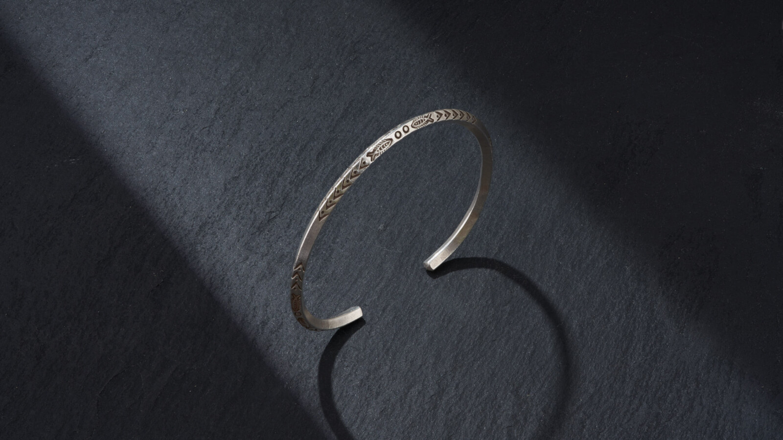 ブレスレットの背景は、MDFに壁紙の下地パテを塗って凹凸を作り、松煙と柿渋を塗ったものです。