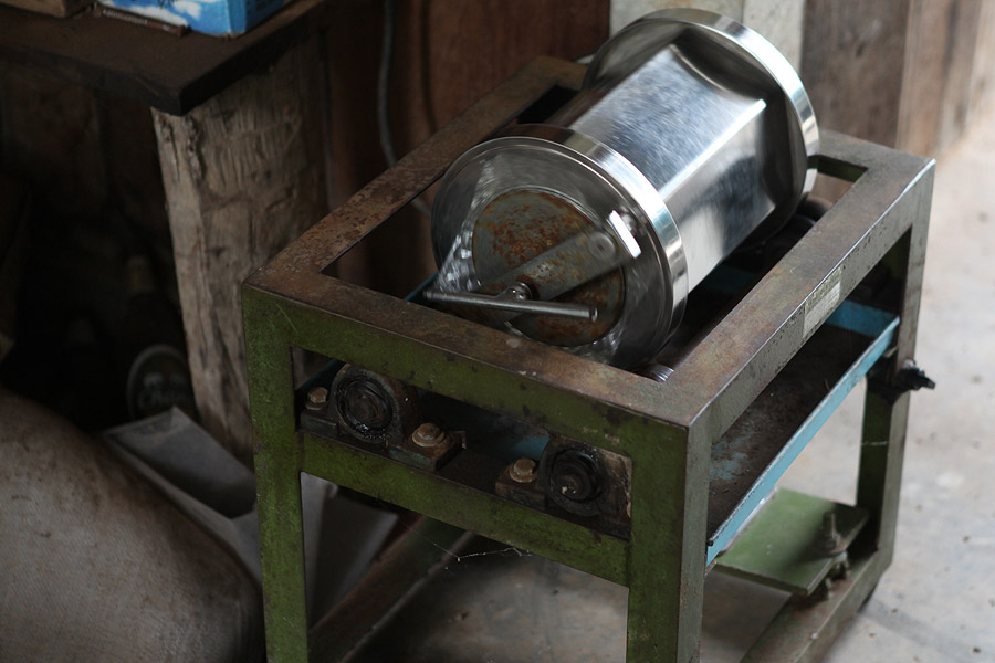 もみ殻とシルバーが入ったドラム部分が回転し、もみ殻とシルバーが擦れあって研磨する仕組みです。