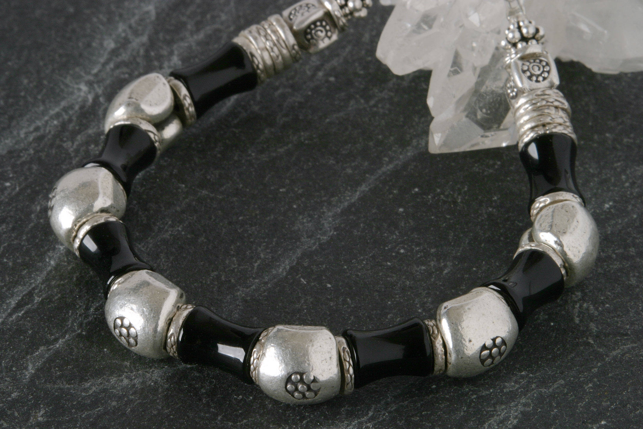 カレン族シルバー 漆黒の輝き オニキス ビーズ 紡錘形 ブレスレット アンクレット 眼文様 護身符 お守り 魔除け SV950 a06-55