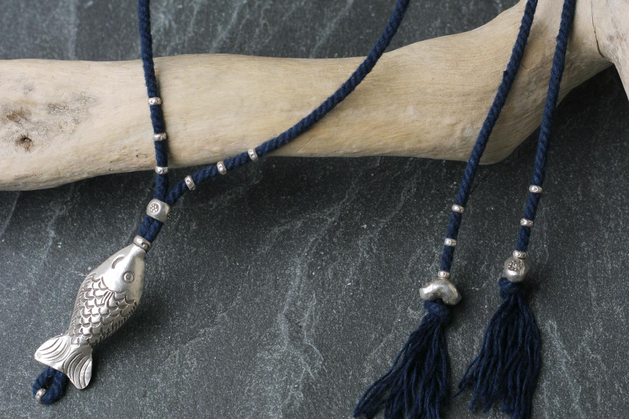 カレン族シルバー ビーズ 藍染手紡ぎ紐 ネックレス フリーサイズ 愛嬌ある魚ペンダント SV950 a01-23