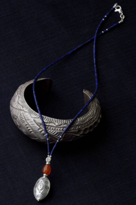 カレン族シルバー フェルメールを虜にした青 ラピスラズリ ビーズ 極細 ネックレス 弓矢文様ペンダント SV950 a03-06