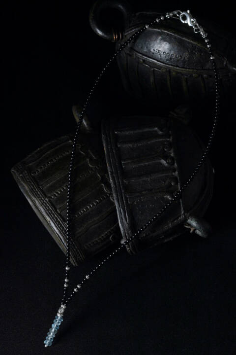 • カレン族シルバー 清流のしずく 一粒 ブルートパーズ 漆黒の輝き オニキス ビーズ ネックレス 魔除け SV950 a03-69