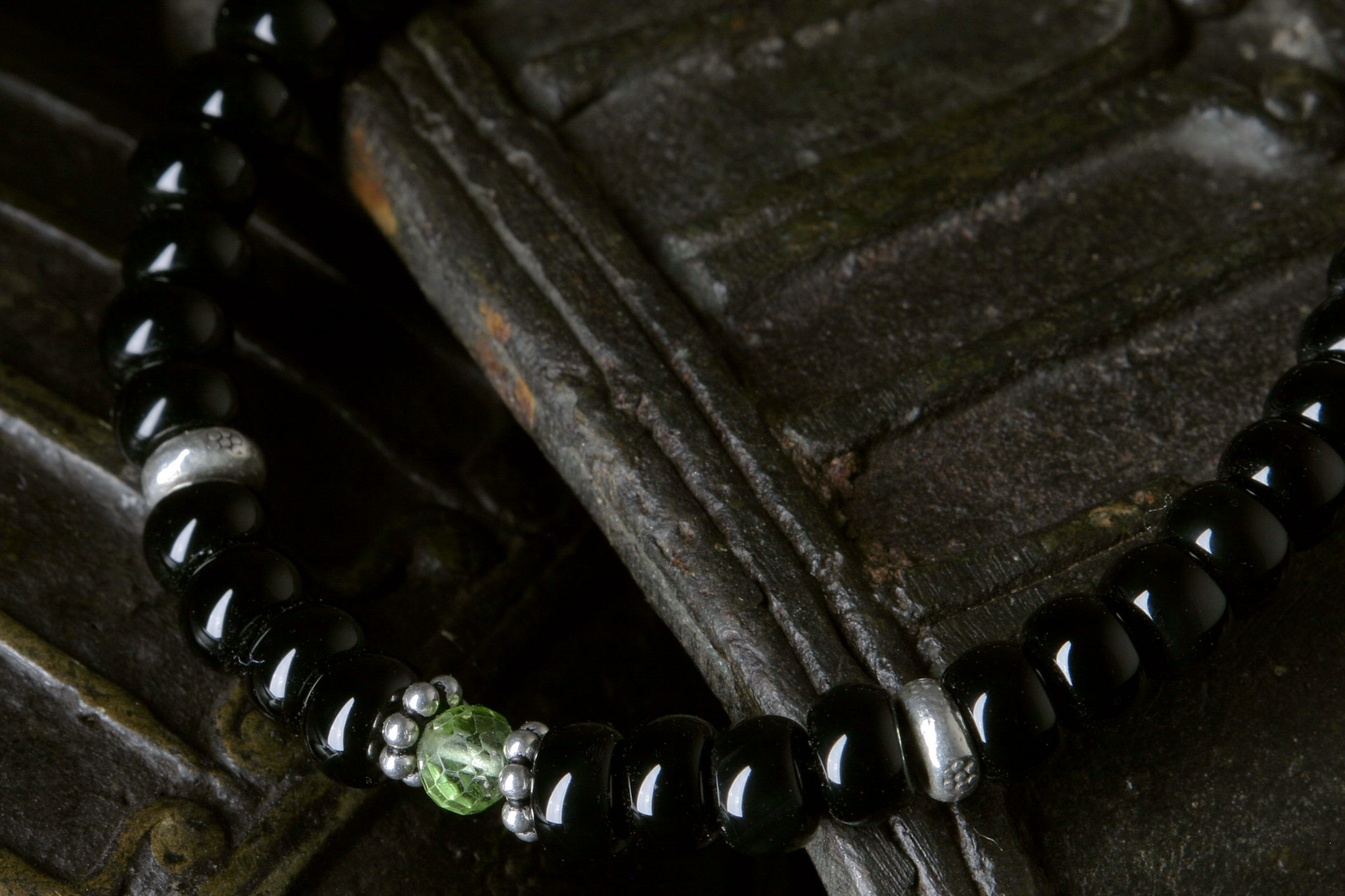 カレン族シルバー 萌え立つ緑 ペリドット 漆黒の輝き オニキス ビーズ ブレスレット アンクレット 魔除け SV950 a06-58