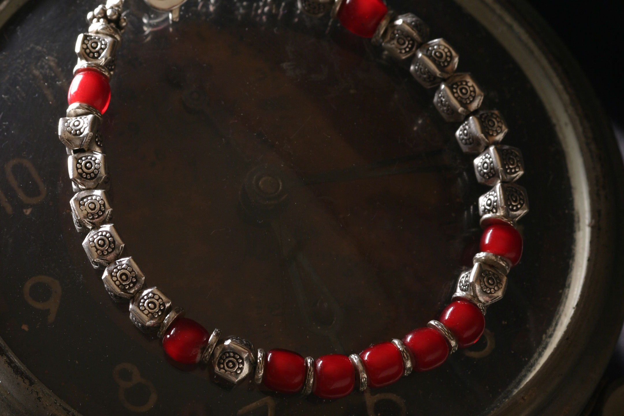カレン族シルバー ナガ族 先祖伝来 ホワイトハート ビーズ 赤 アカ族 アンティークビーズ ブレスレット アンクレット SV950 a05-52
