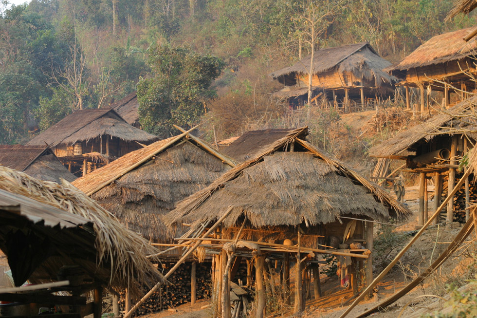 電気も水道もない山奥のカレン族の村。険しい山の斜面にカレン族の伝統的な高床式家屋が密集して建てられています。