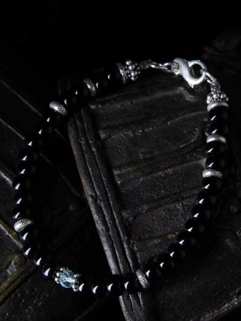 カッティングされたペリドットが漆黒のブラックオニキスの間にきらめくブレスレットです。清涼感のある淡い緑色は光を通すと反射と屈折によりきらめき、美しい色模様を演出します。
