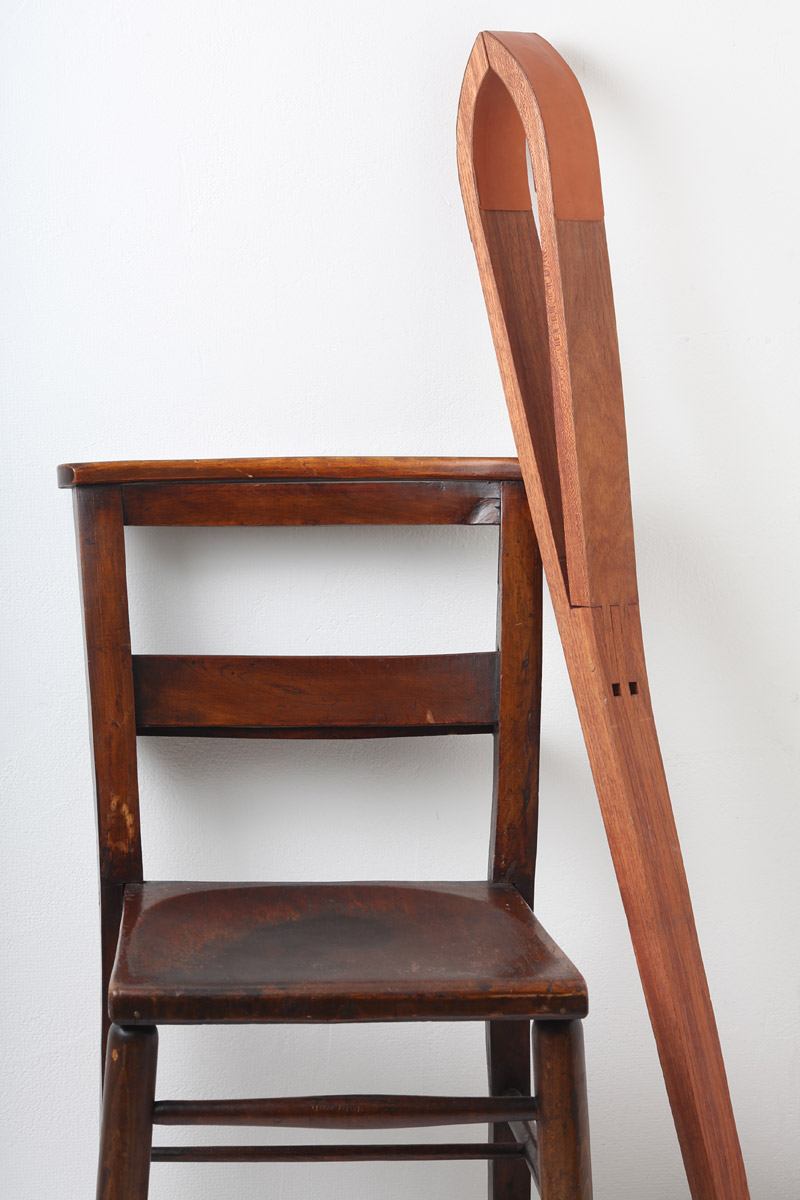 この大きなクリップは革を挟んで手縫いする道具。膝に挟んで固定します。