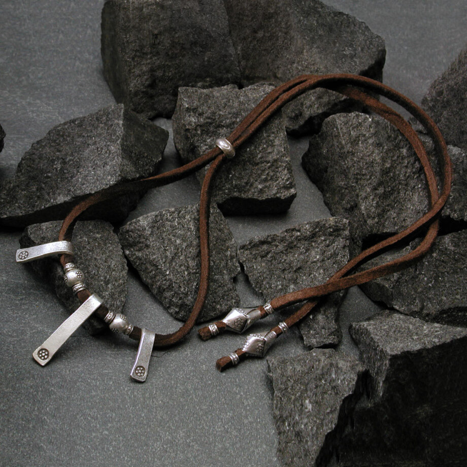 シンプルな刻印を刻んだ厚みのあるカレンシルバーをトップにあしらった鹿革紐ネックレスです。