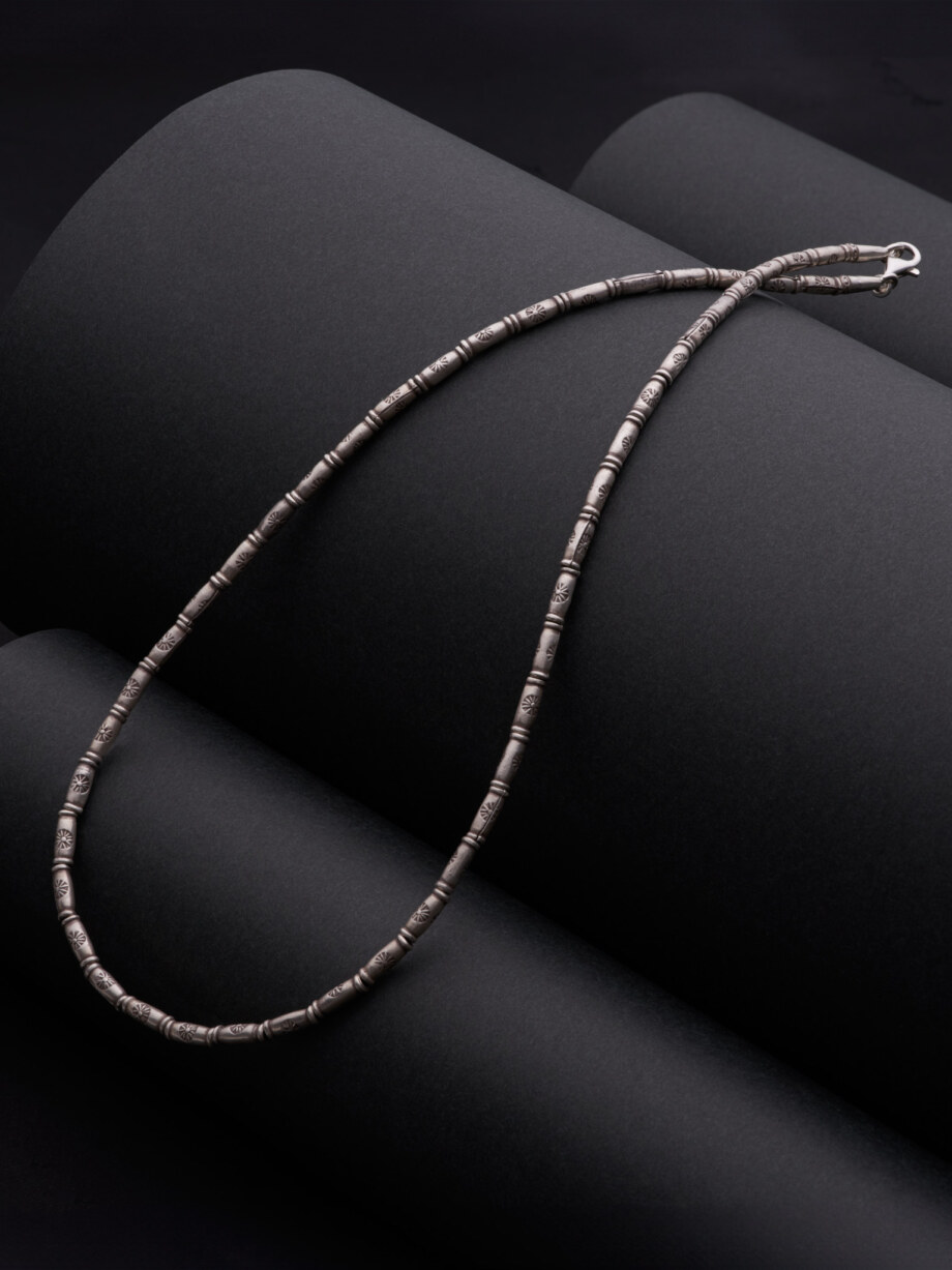 落ち着いた銀の質感は、首元にしっくりと馴染みます。