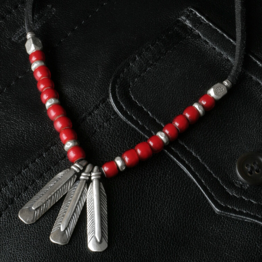 鳥の羽を模した3枚のカレンシルバーを重ね、トップにあしらった鹿革紐ネックレスです。