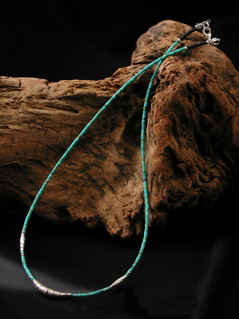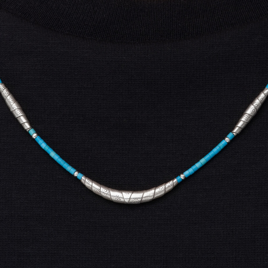 三日月形のカレンシルバーをトップにあしらい、一見絹糸にも見える極小ターコイズビーズを連ねたネックレスです。