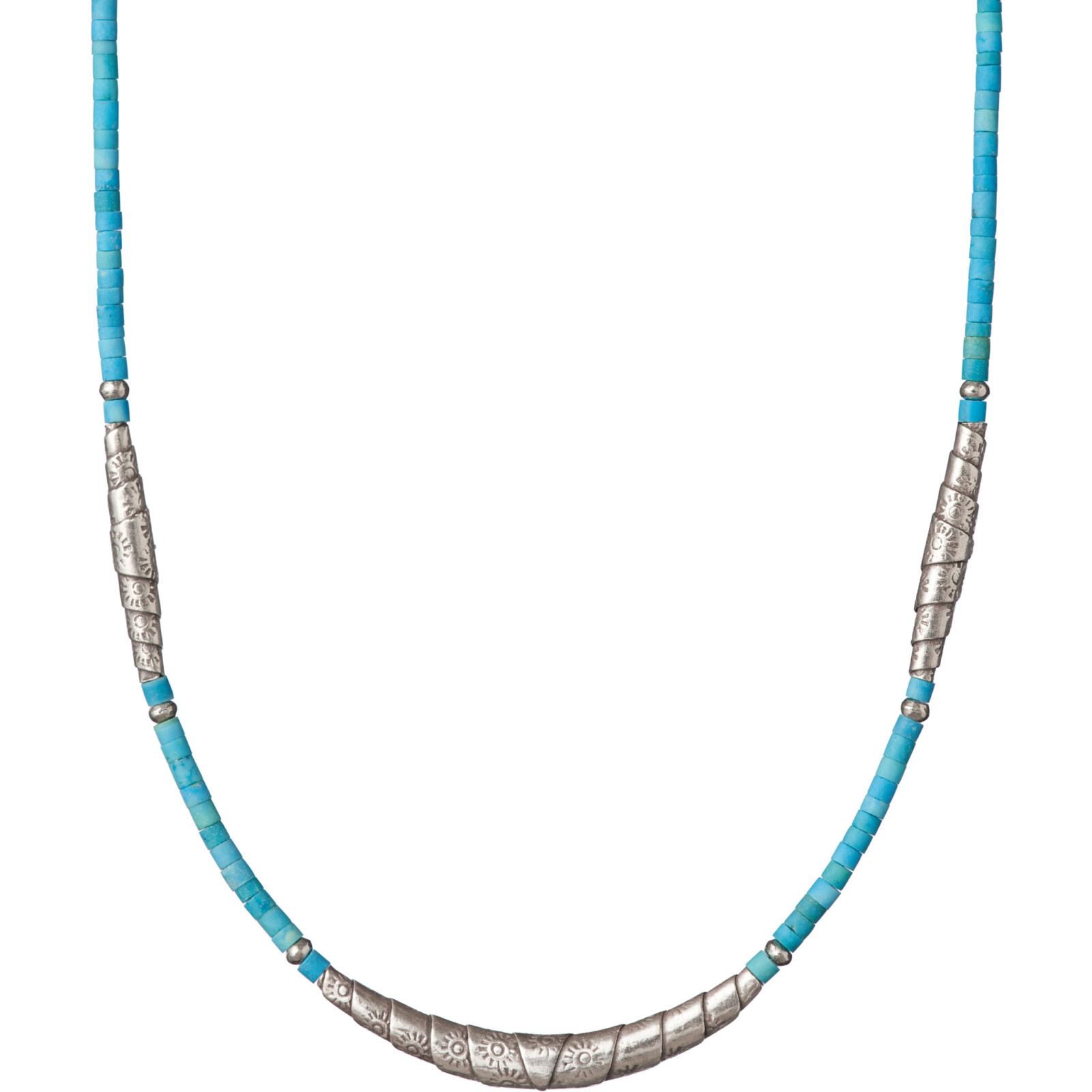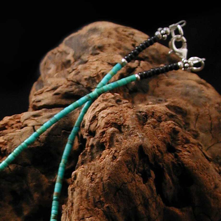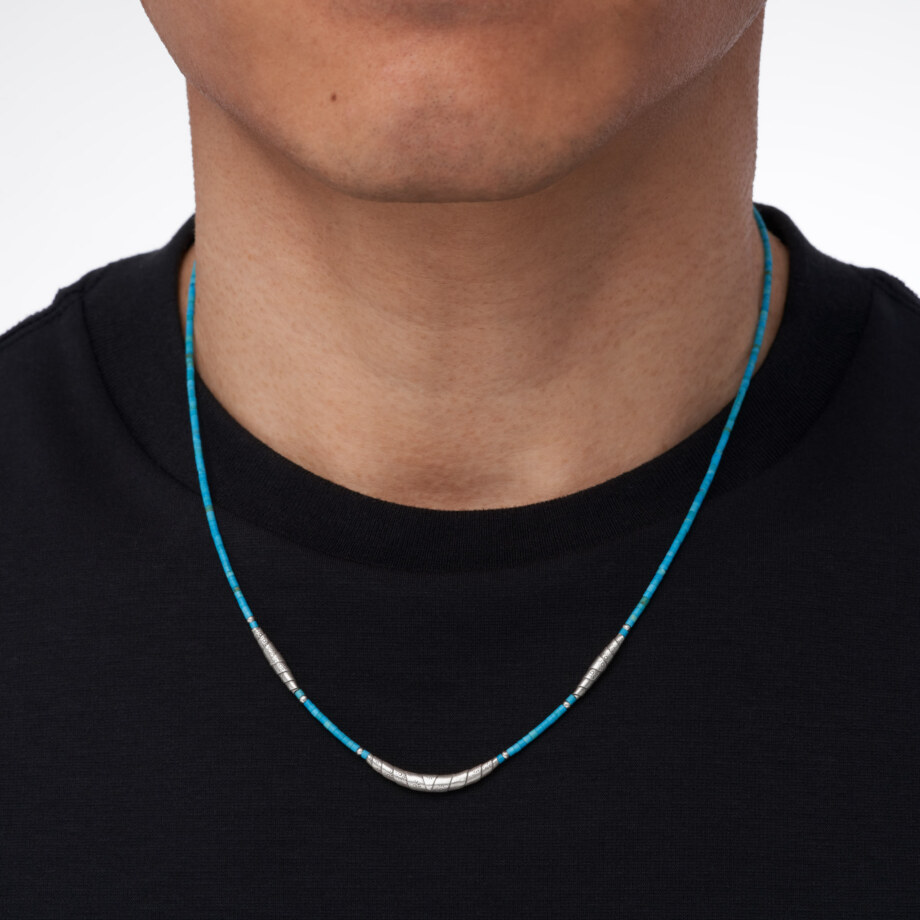 不揃いのターコイズビーズから色・形の良いものだけを選りすぐり、太さをそろえて丁寧に仕上げることで、すっきりなめらかな曲線を描きます。
