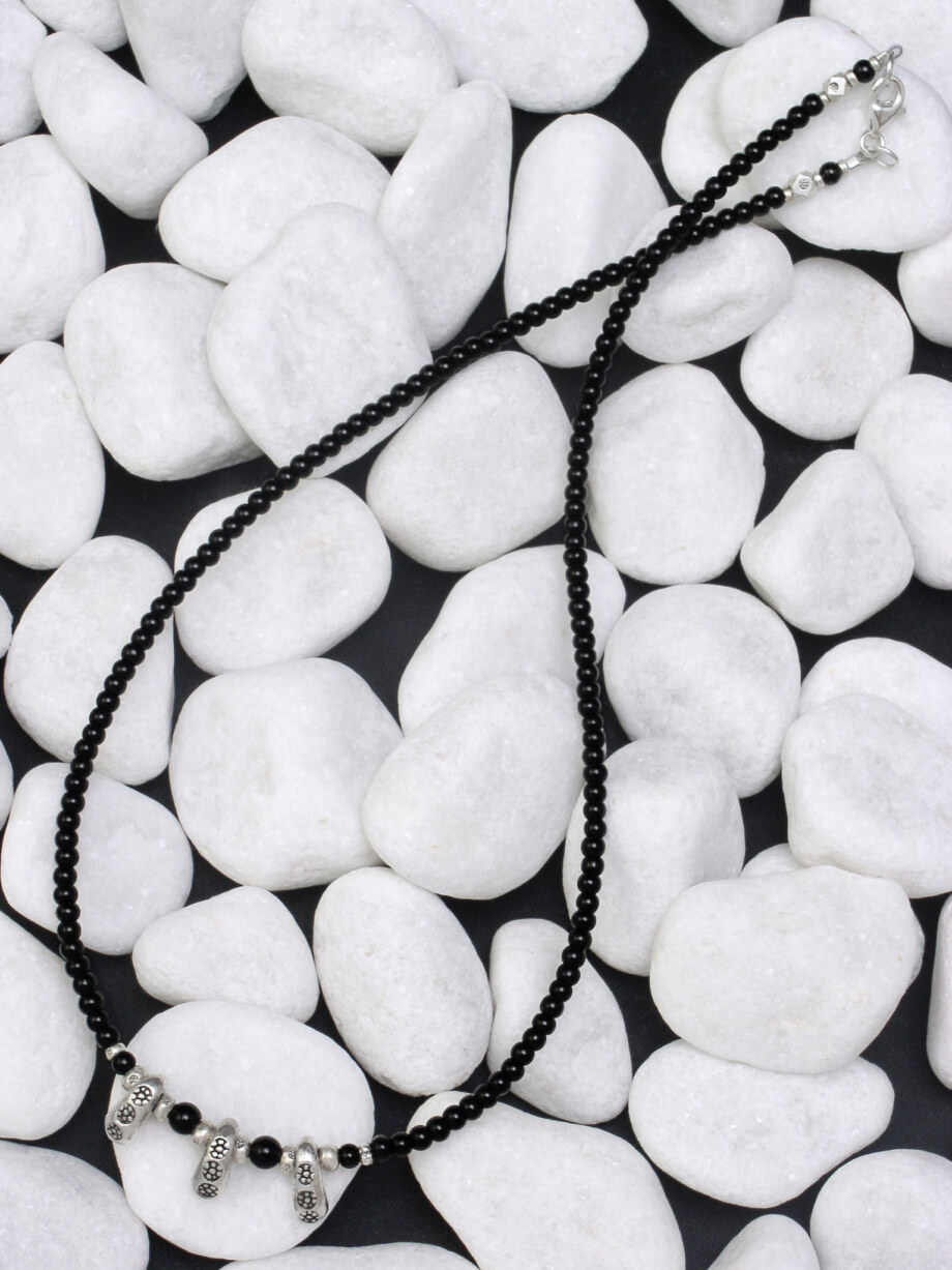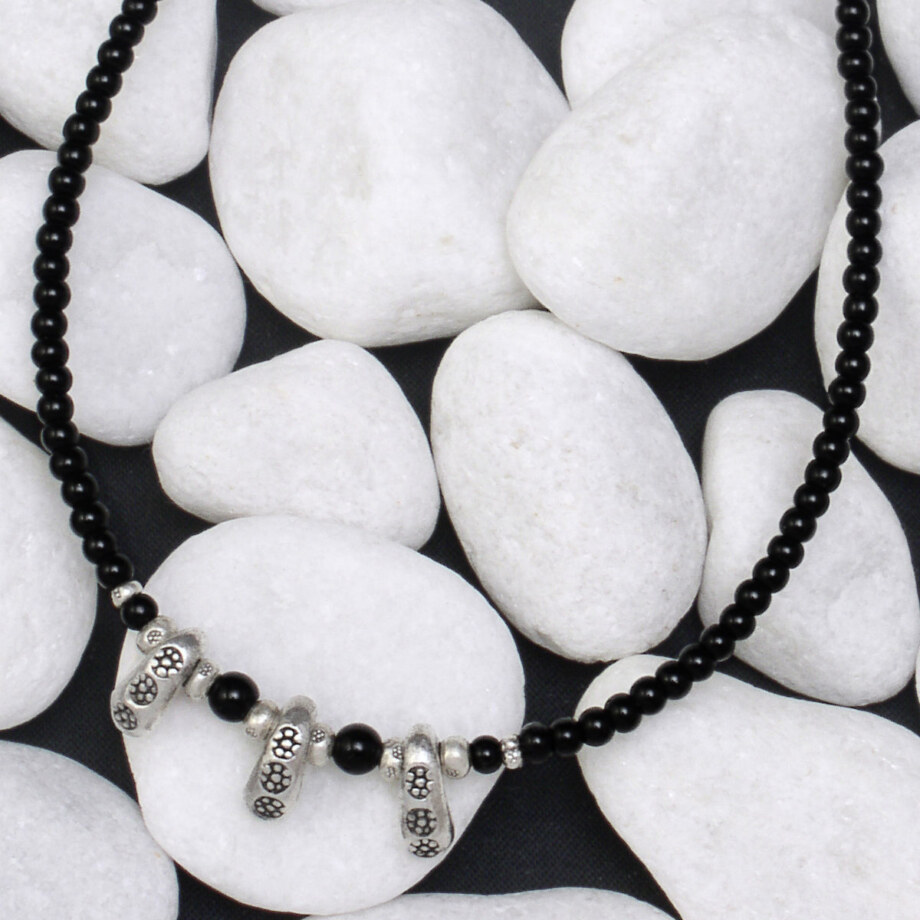 連なる漆黒のブラックオニキスに、勾玉形のカレンシルバービーズ3個をトップに据えたネックレスです。