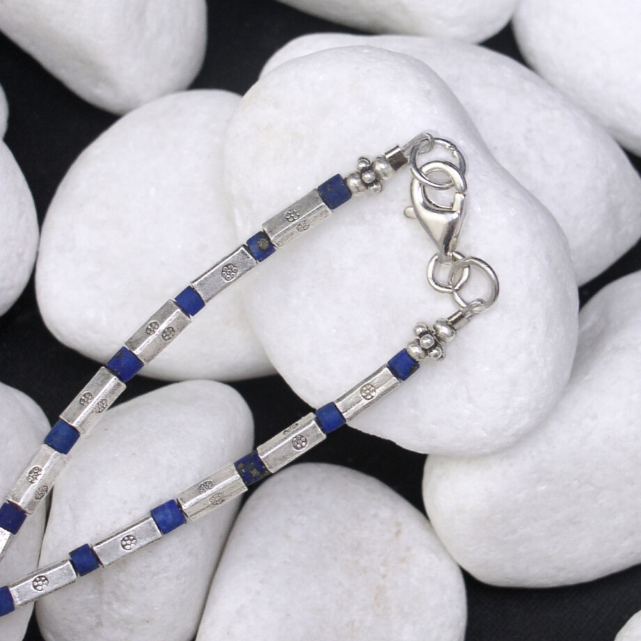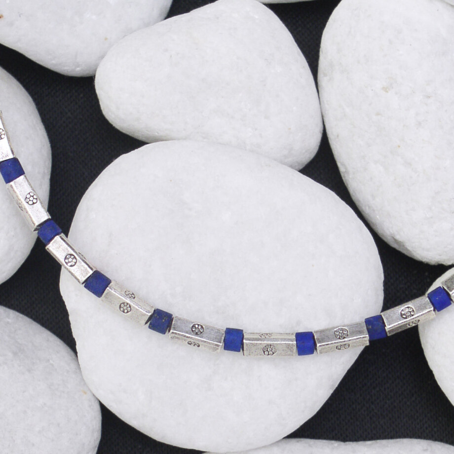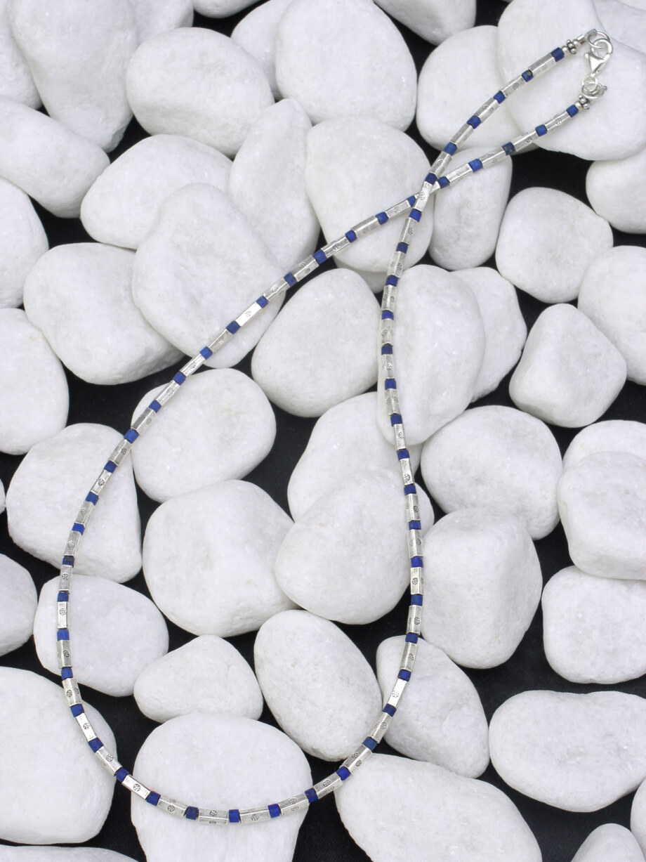 直方体で細身のカレンシルバービーズとラピスラズリが交互に繰り返すネックレスです。