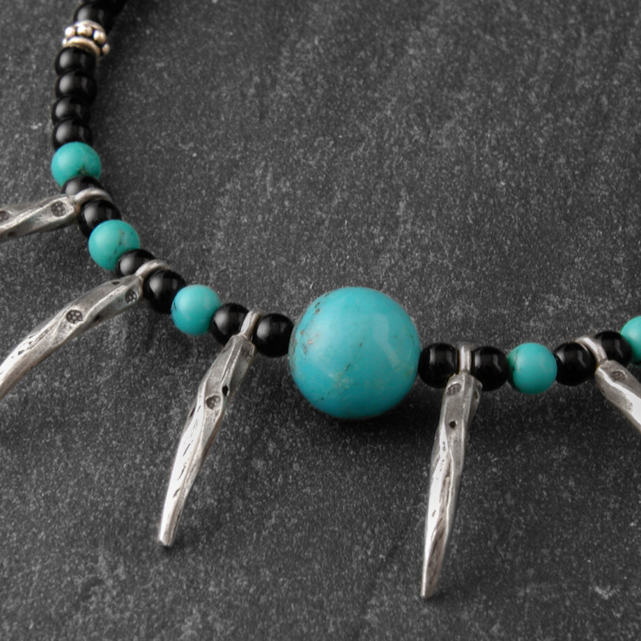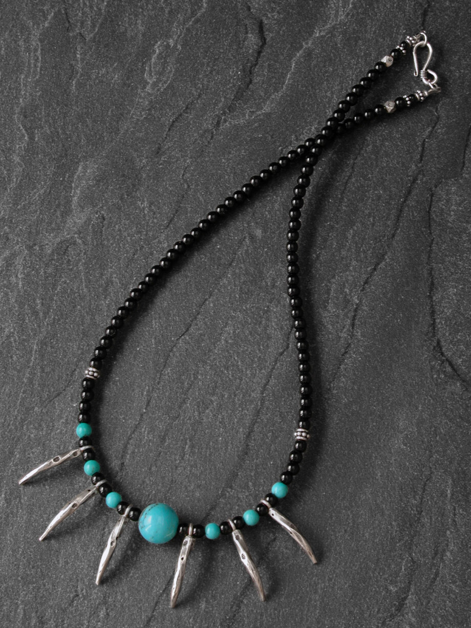 カレン族シルバー 天然無染色 ターコイズ 12mm玉 漆黒の輝き オニキス ビーズ ネックレス 獣の爪ペンダント 魔除け SV950 a03-25