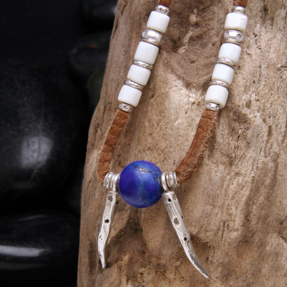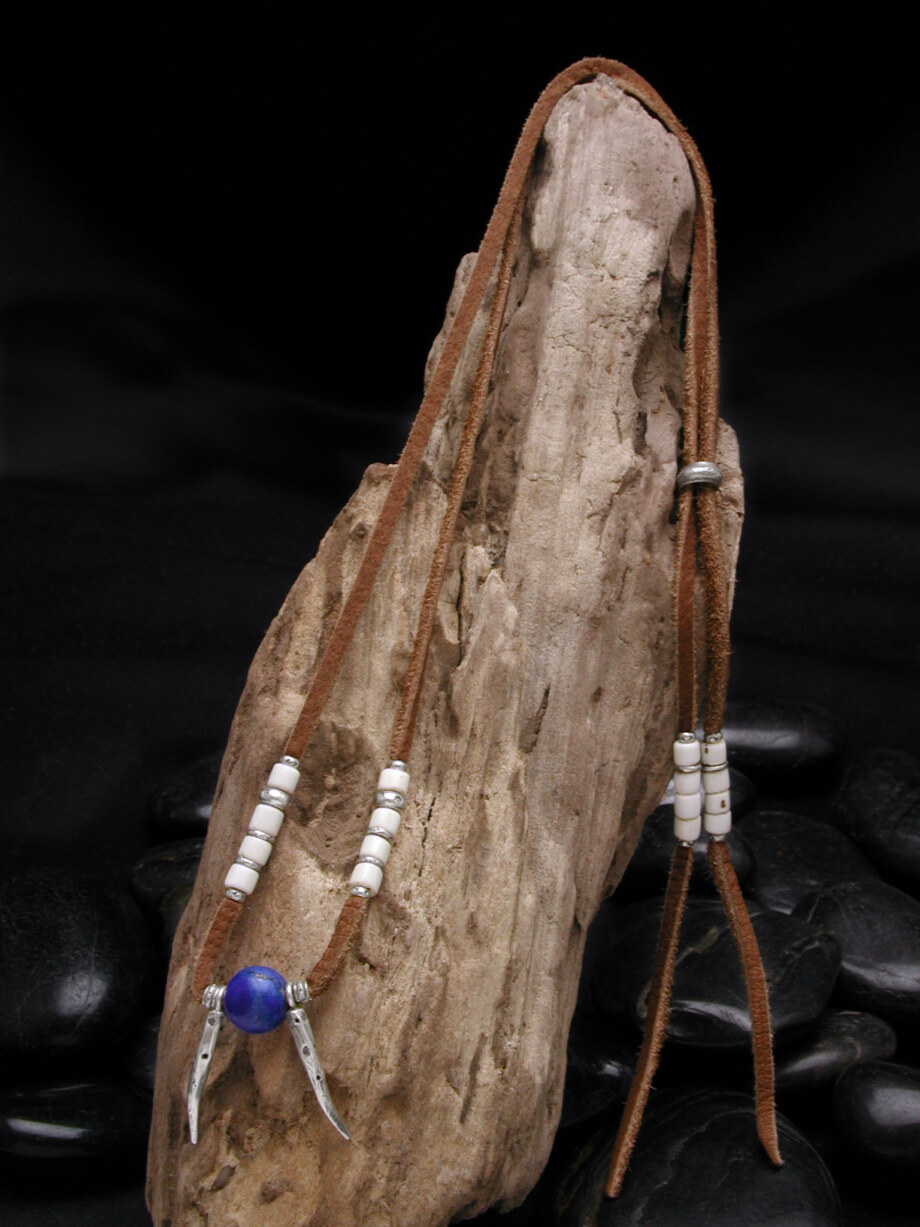 獣の鉤爪がモチーフのカレンシルバーをラピスラズリ12mm玉の両脇にあしらった鹿革紐ネックレスです。