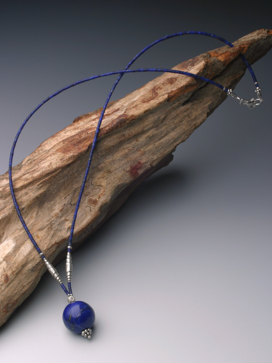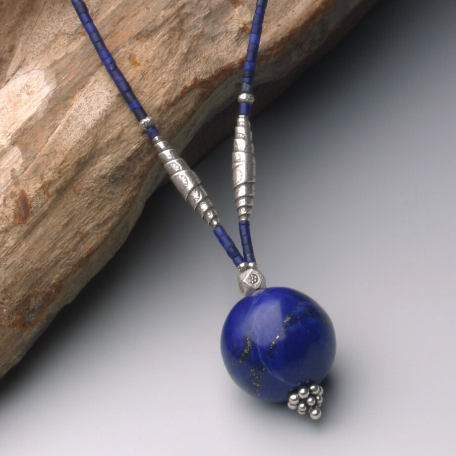極小ラピスラズリビーズが連なって青の絹糸のようにも見える先端に、大ぶりで上質なラピスラズリ14mm玉をあしらったネックレスです。
