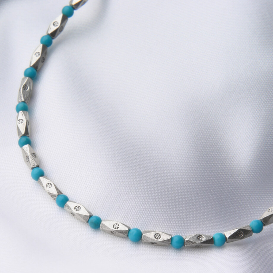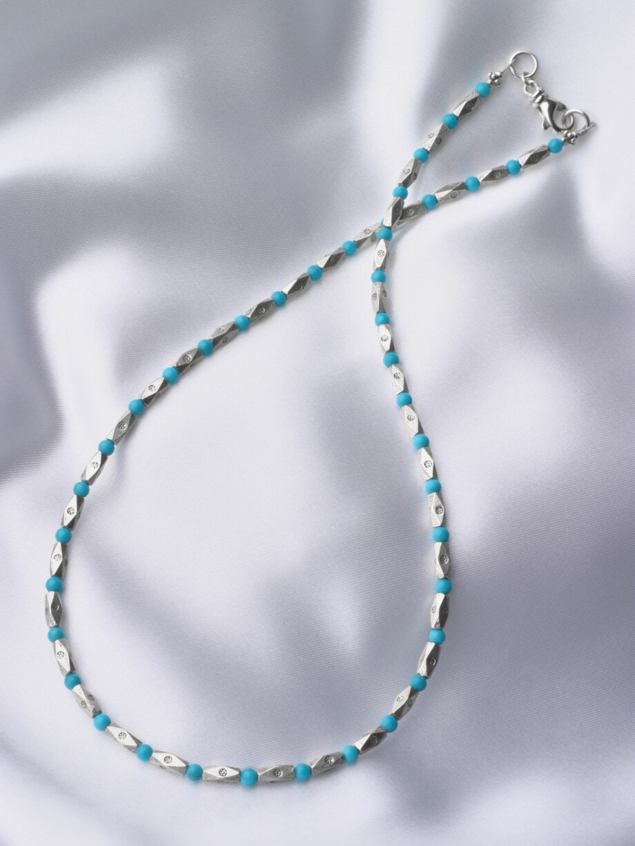 天然無染色のターコイズと、直方体の角を削り落としたカレンシルバーが交互に繰り返すネックレスです。