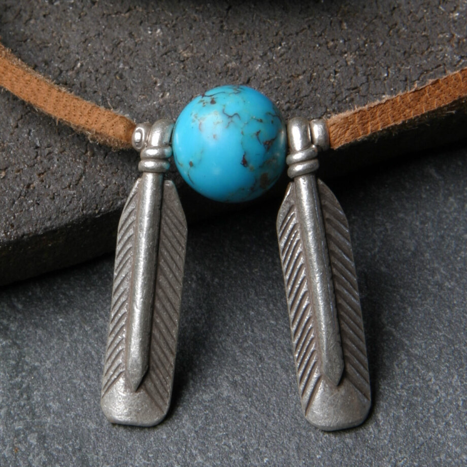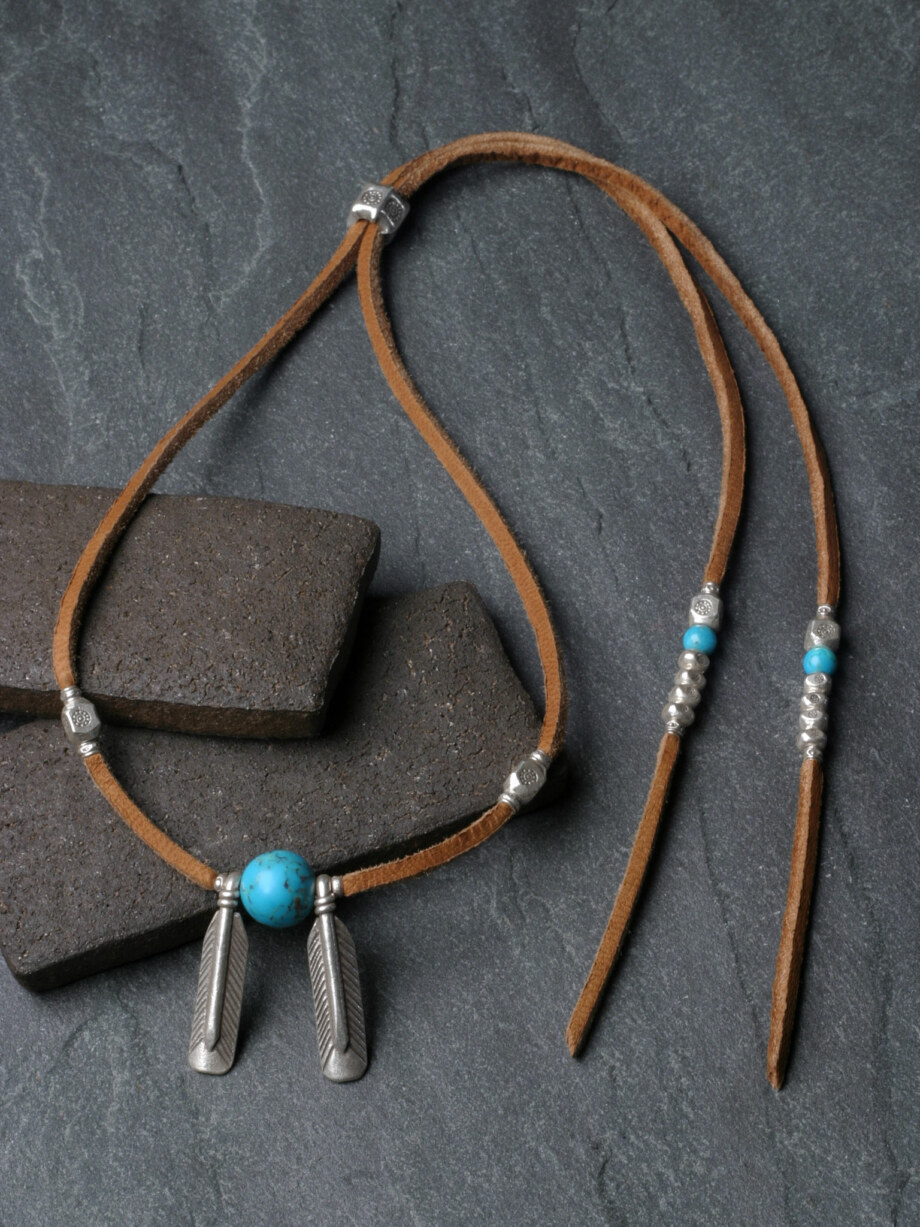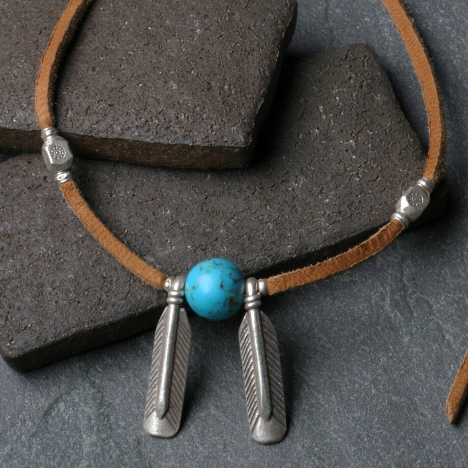 天然無染色で上質のターコイズ12mm玉の両脇に、鳥の羽根をモチーフにしたカレンシルバーを2枚吊り下げた鹿革紐ネックレスです。