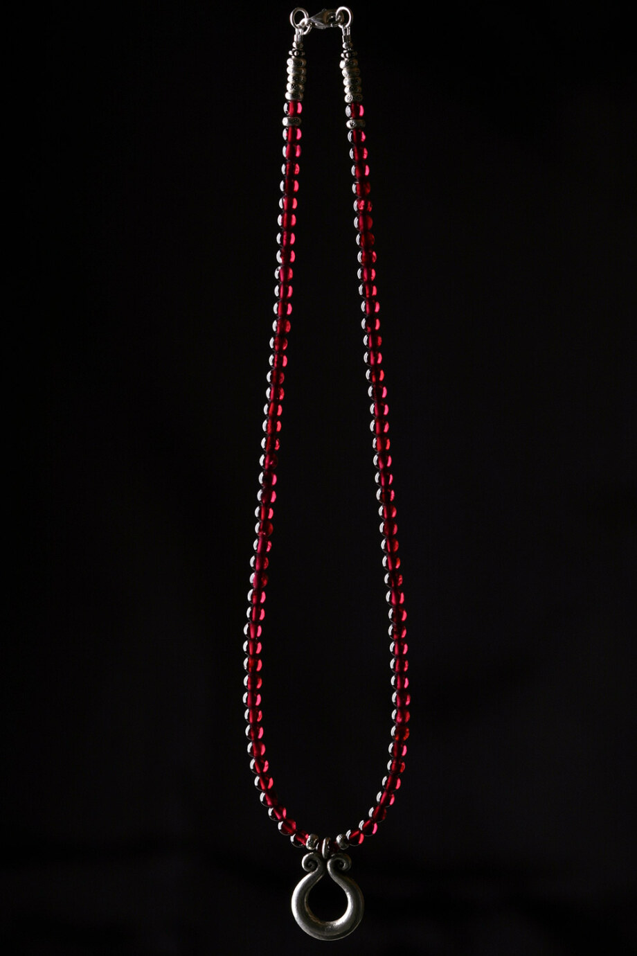 両端をくるくる巻いた渦巻がユニークな涙形ペンダントを中央にあしらったガーネットネックレスです。