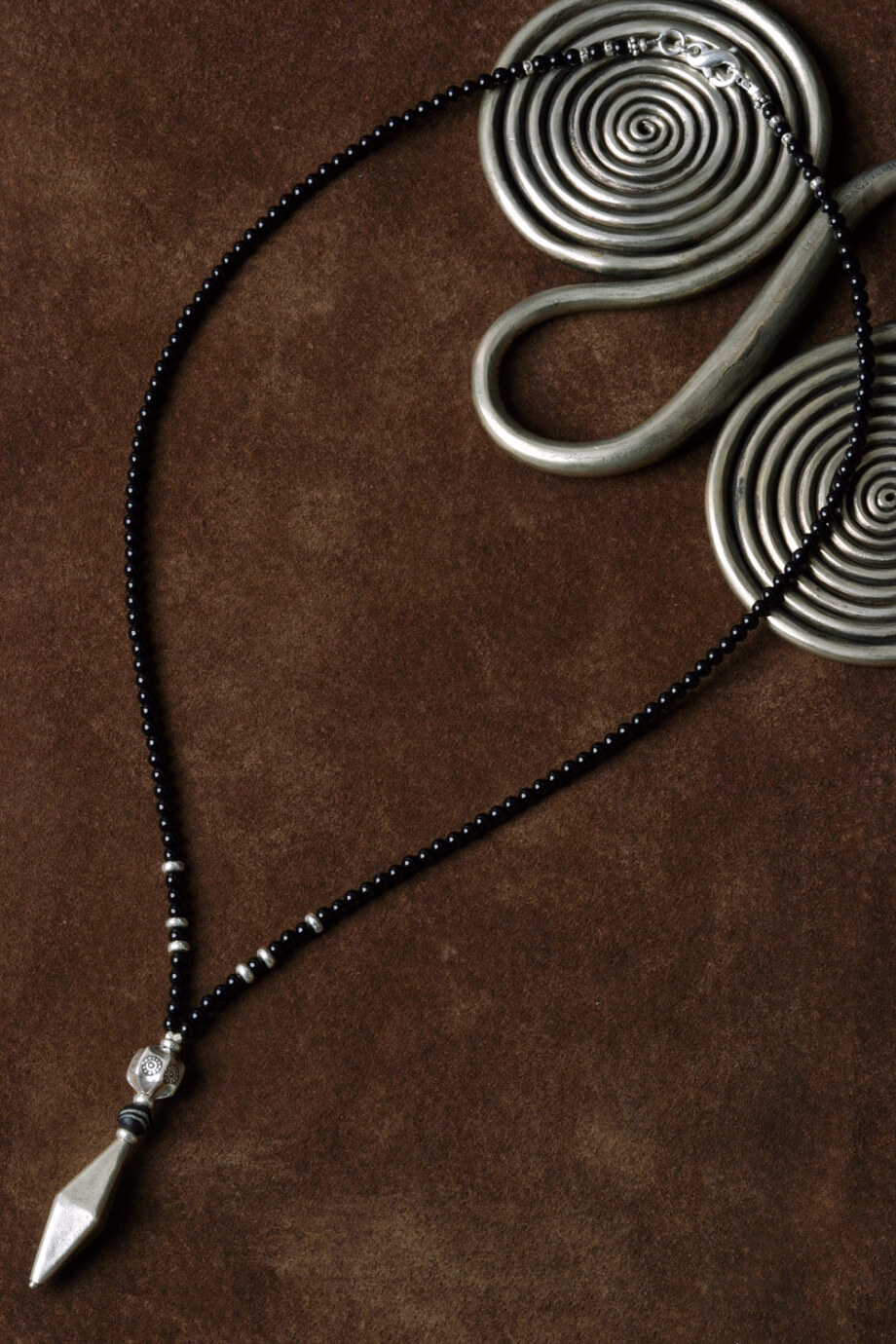 V字のラインを描くブラックオニキスが連なる先端に、八面体のカレンシルバーを据えたネックレスです。