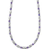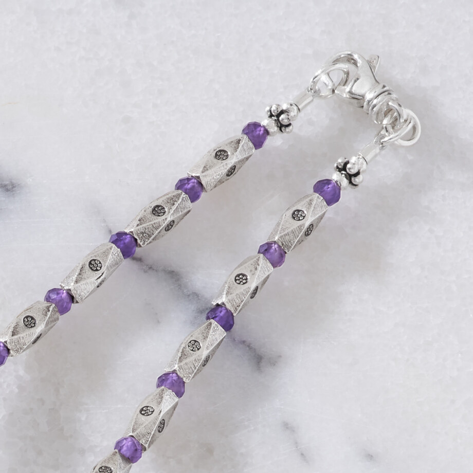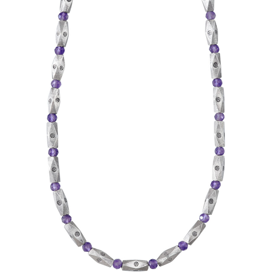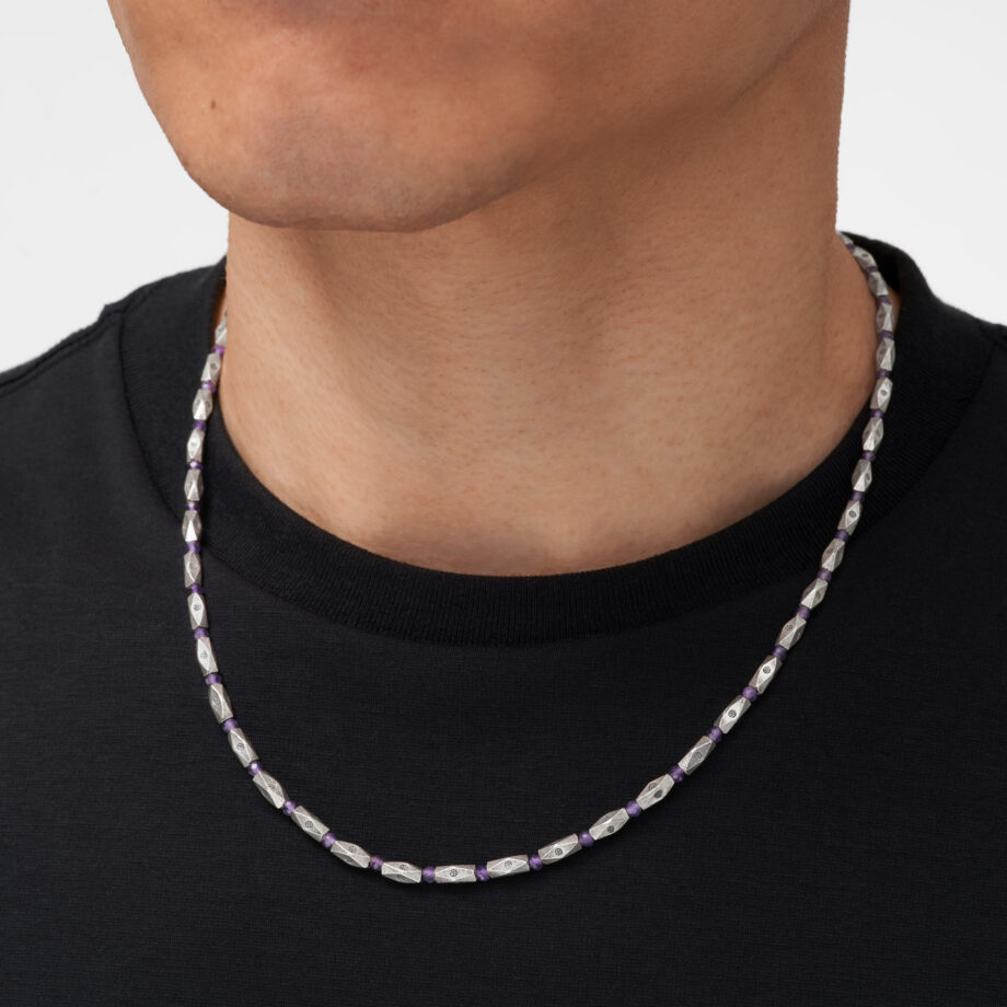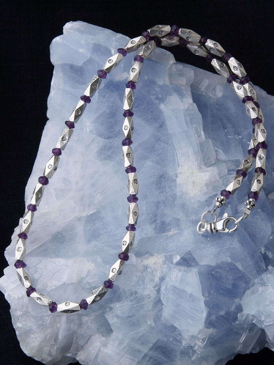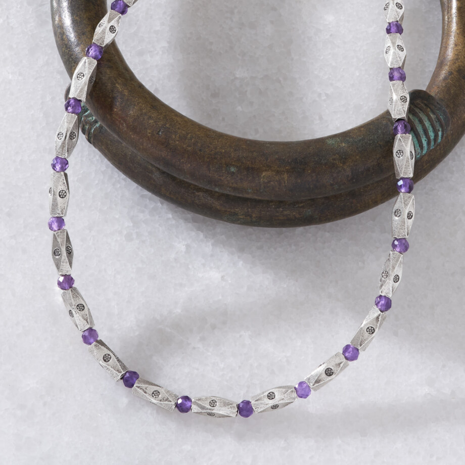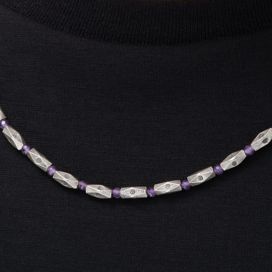 瑞々しい葡萄色のアメジストと、直方体の角を削り落としたカレンシルバーが交互に繰り返すネックレスです。