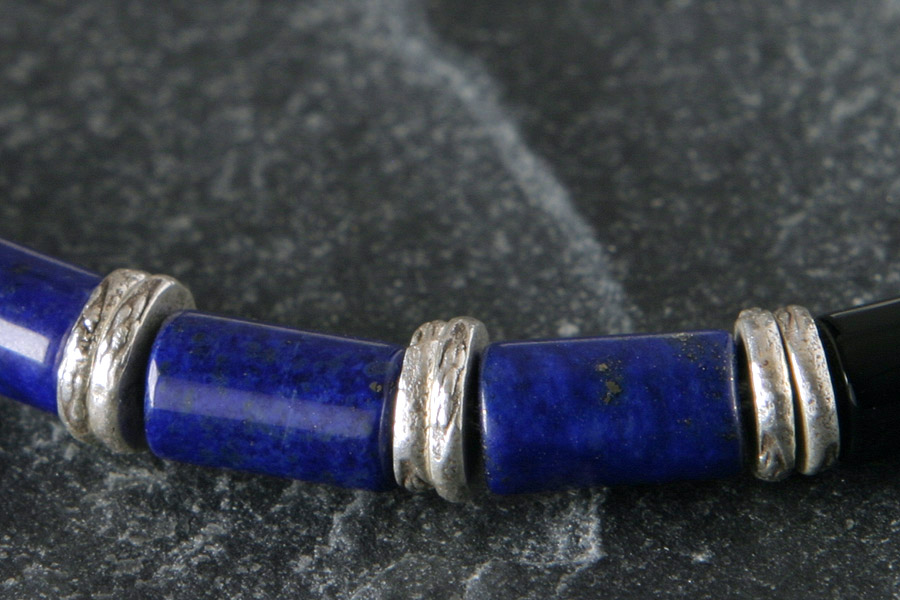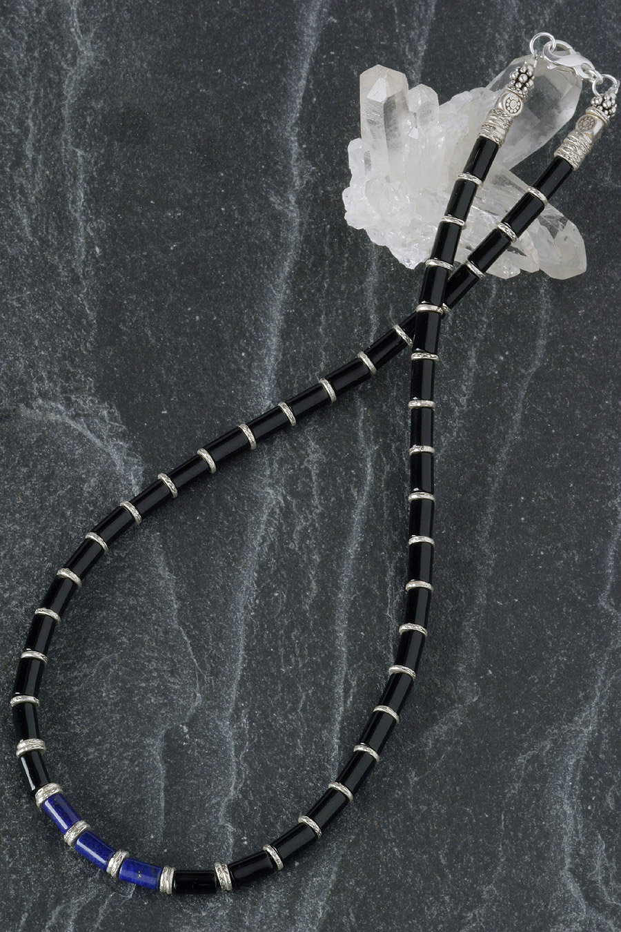 吸い込まれそうなほどに黒い円筒形ブラックアゲートの間に、艶のある上質なラピスラズリを配置したネックレスです。