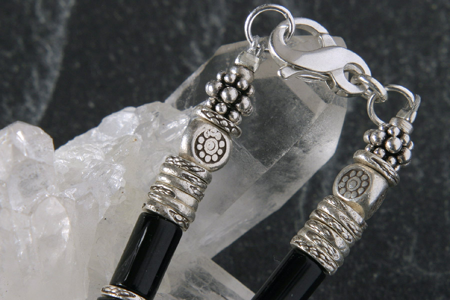 後ろから見られたとき、ふと目に留まるよう、両端に薄い円盤形シルバービーズを積み重ねました。