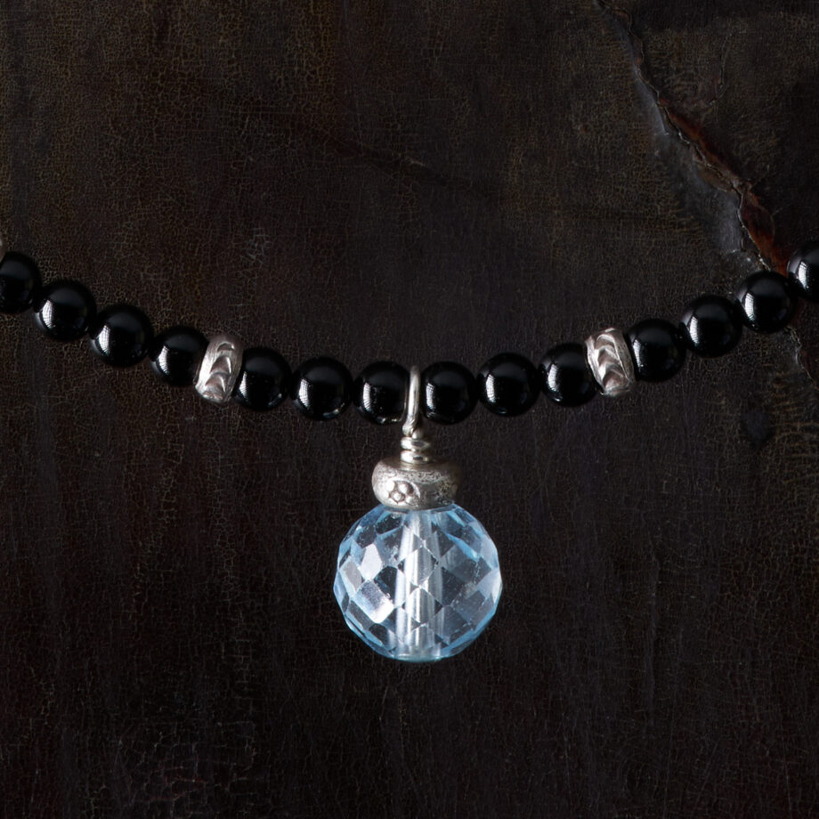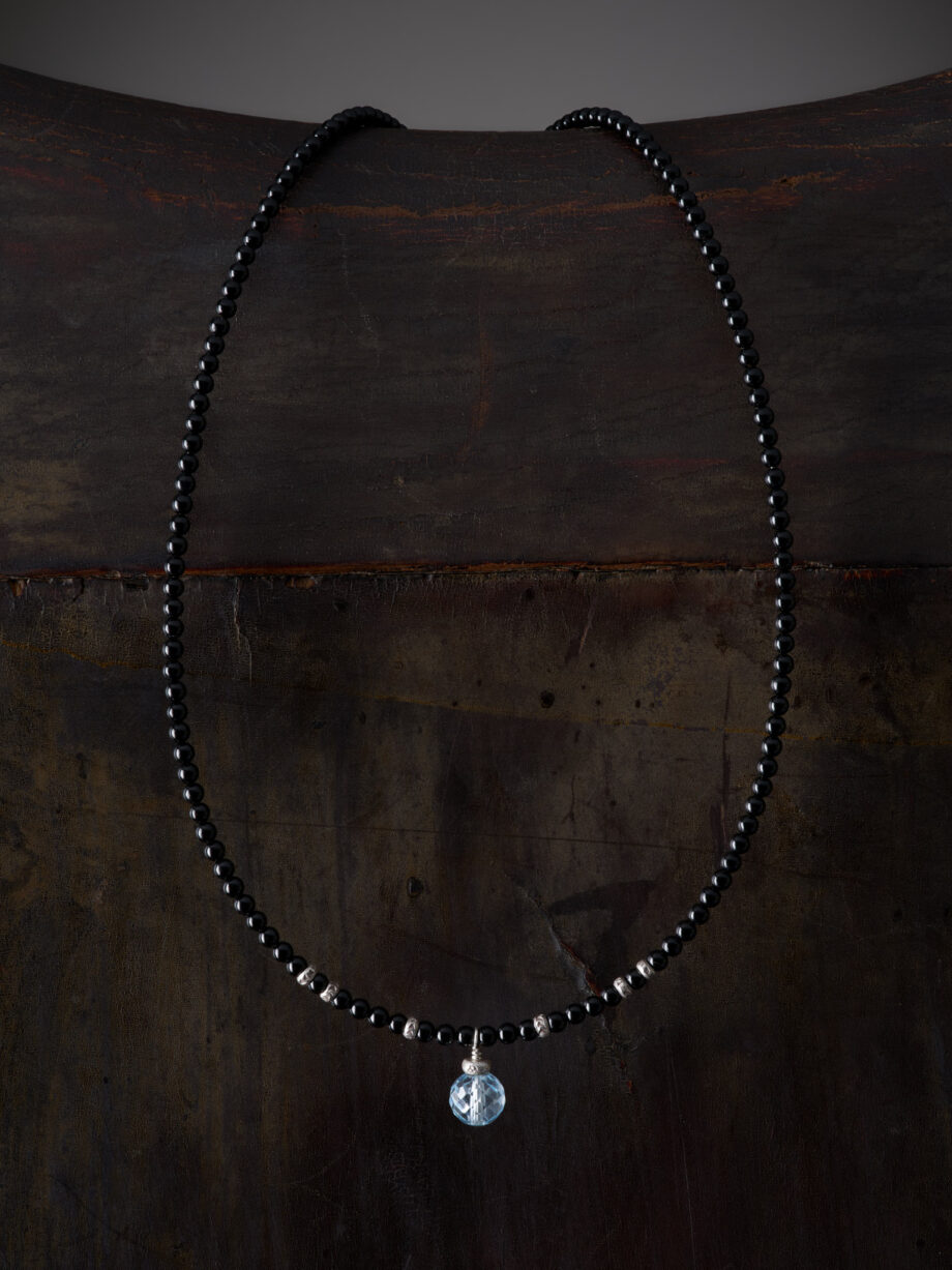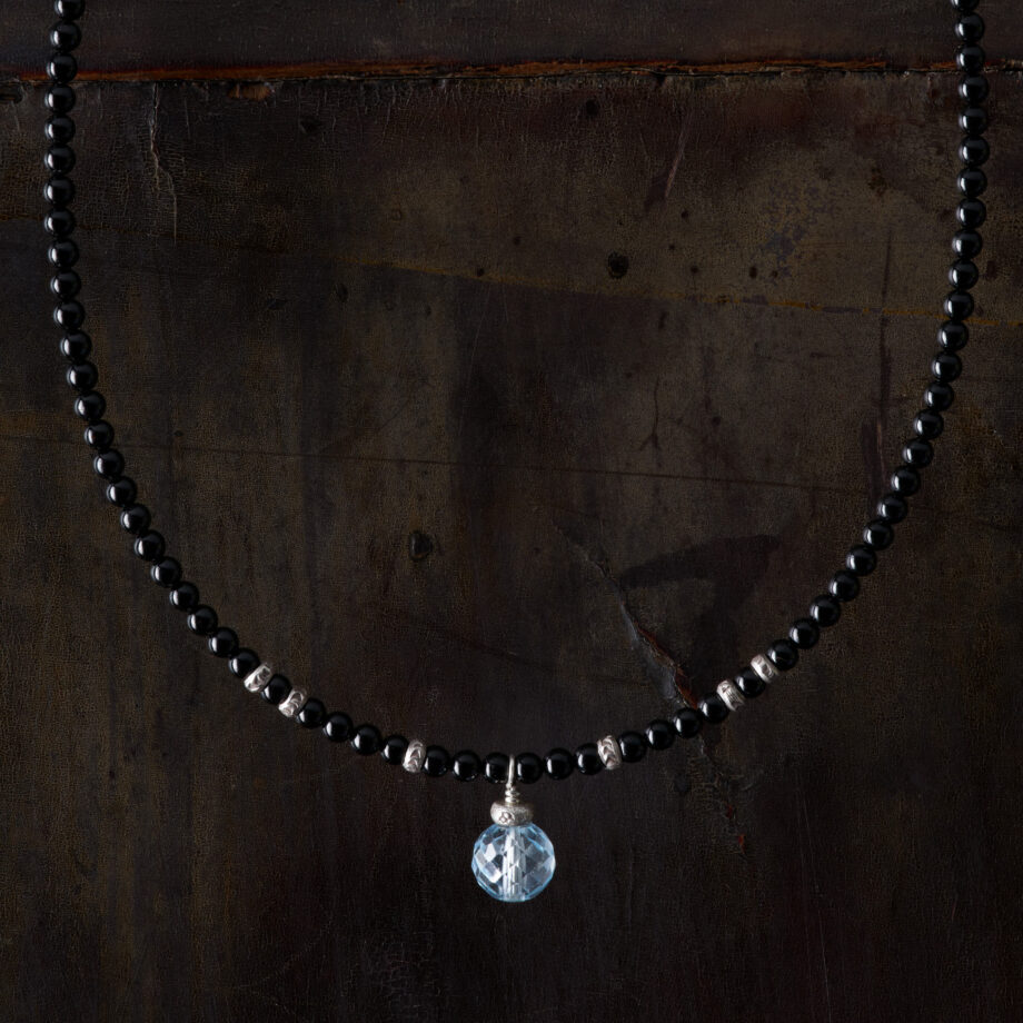 小粒のブラックオニキスビーズが連なるラインの中央に、清流のしずくを思わせる大粒のブルートパーズが一粒、凛と輝くネックレスです。