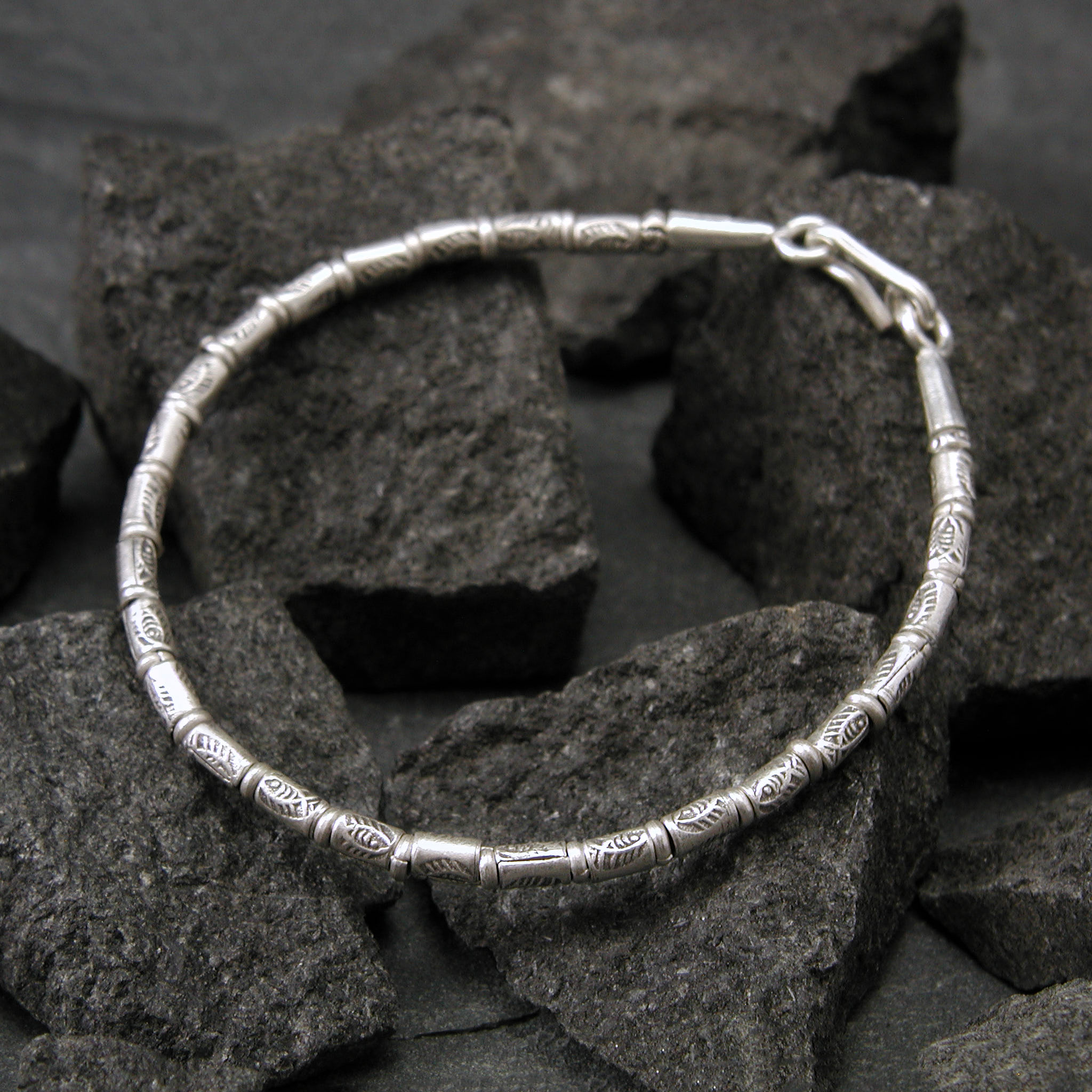 象形化した魚の刻印のカレンシルバーを用いたシンプルなシルバーブレスレットです。
