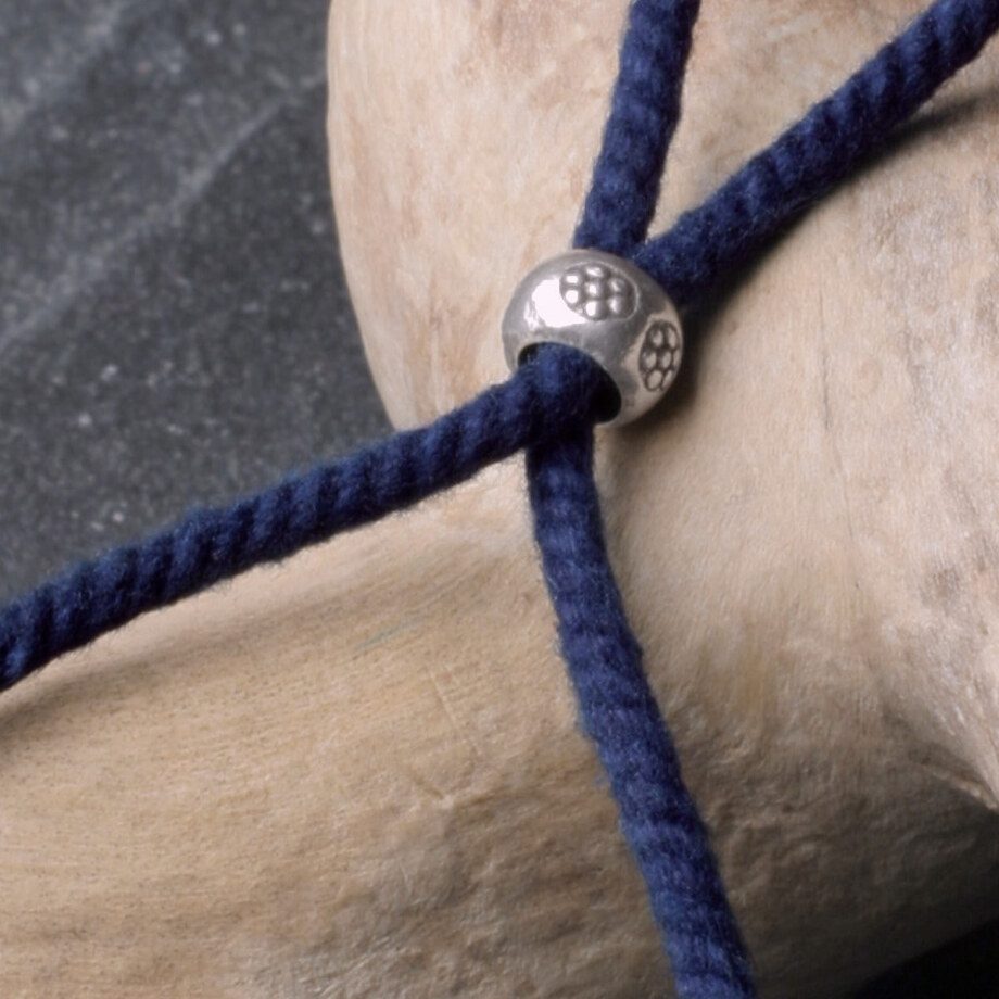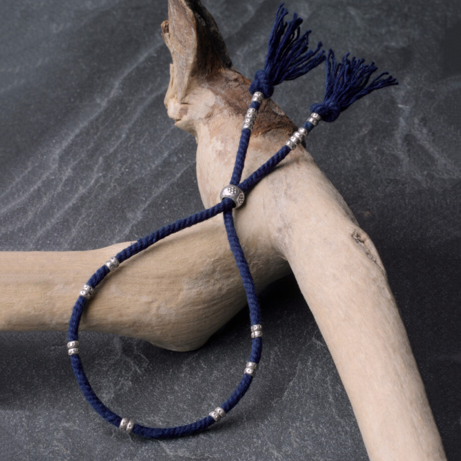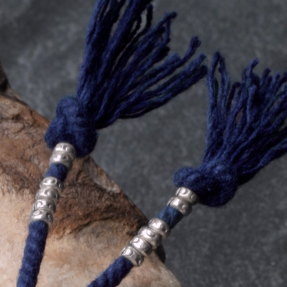 藍染手紡ぎ木綿紐にカレンシルバーをリズミカルに並べることで民族文様のパターンを表現したブレスレットです。