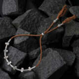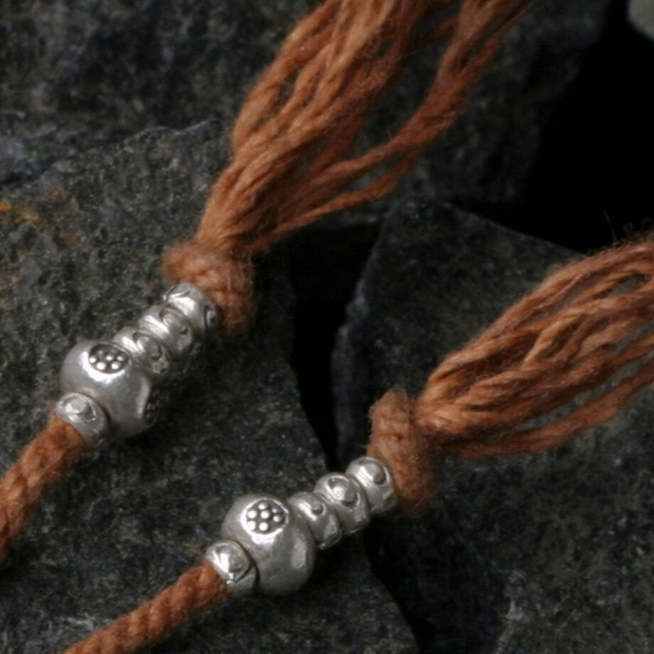 柿渋染手紡ぎ木綿紐に親しみがわく魚の刻印のカレンシルバーを並べた細身のブレスレットです。