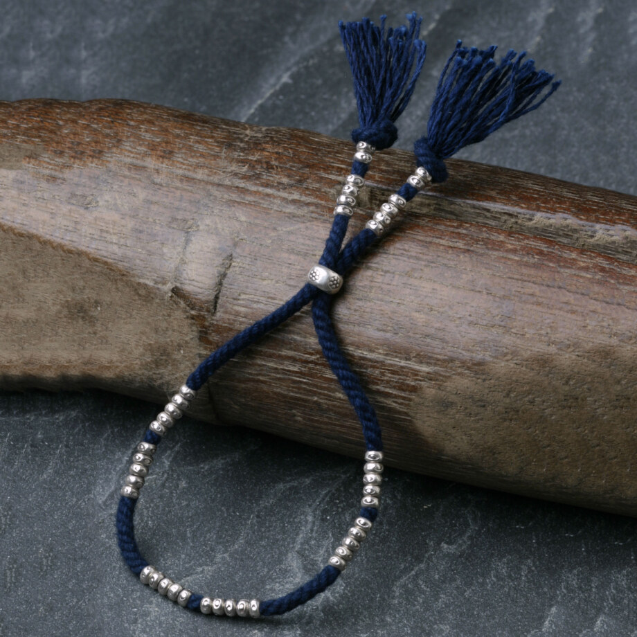 藍染手紡ぎ木綿紐にカレンシルバーをびっしり並べることで民族文様のパターンを表現したブレスレットです。