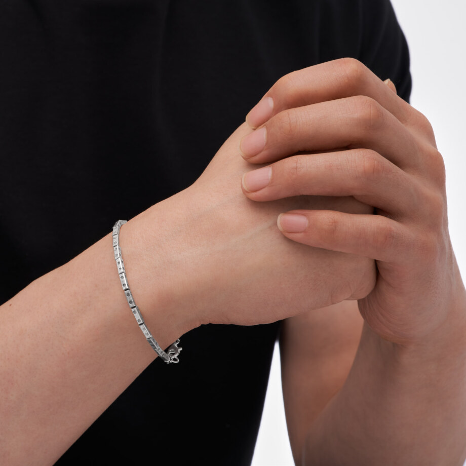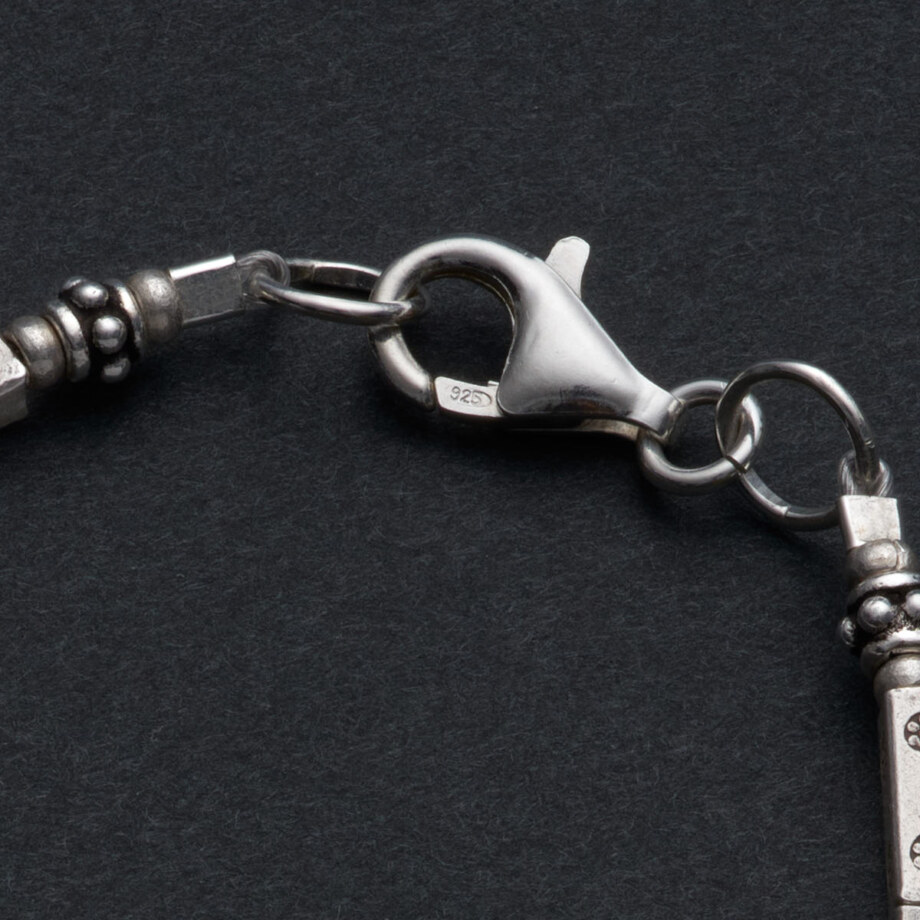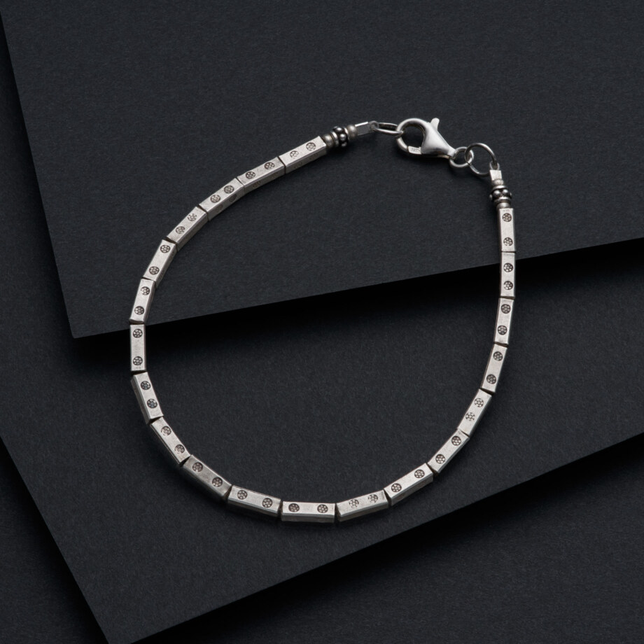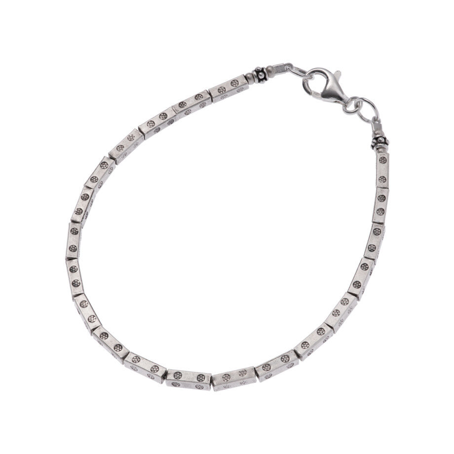 直方体で細身のカレンシルバーを連ねたシンプルでつつましいシルバーブレスレットです。