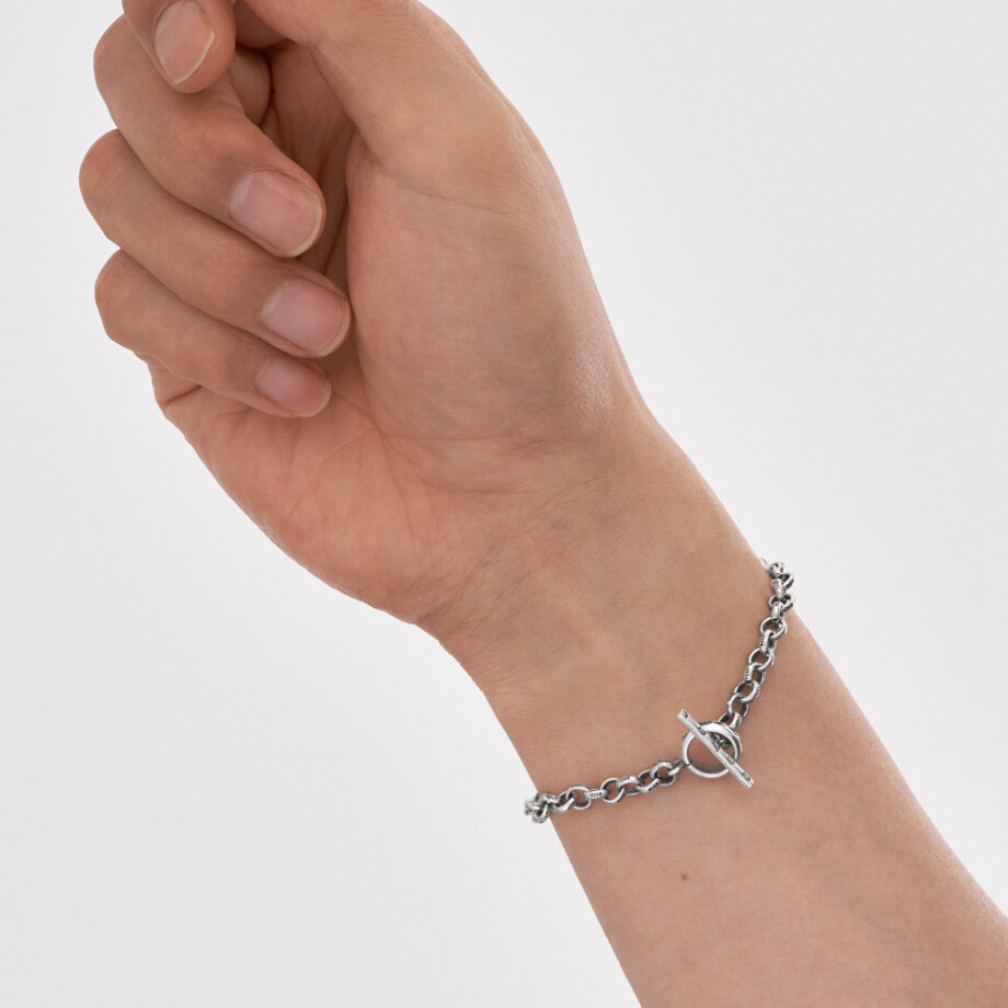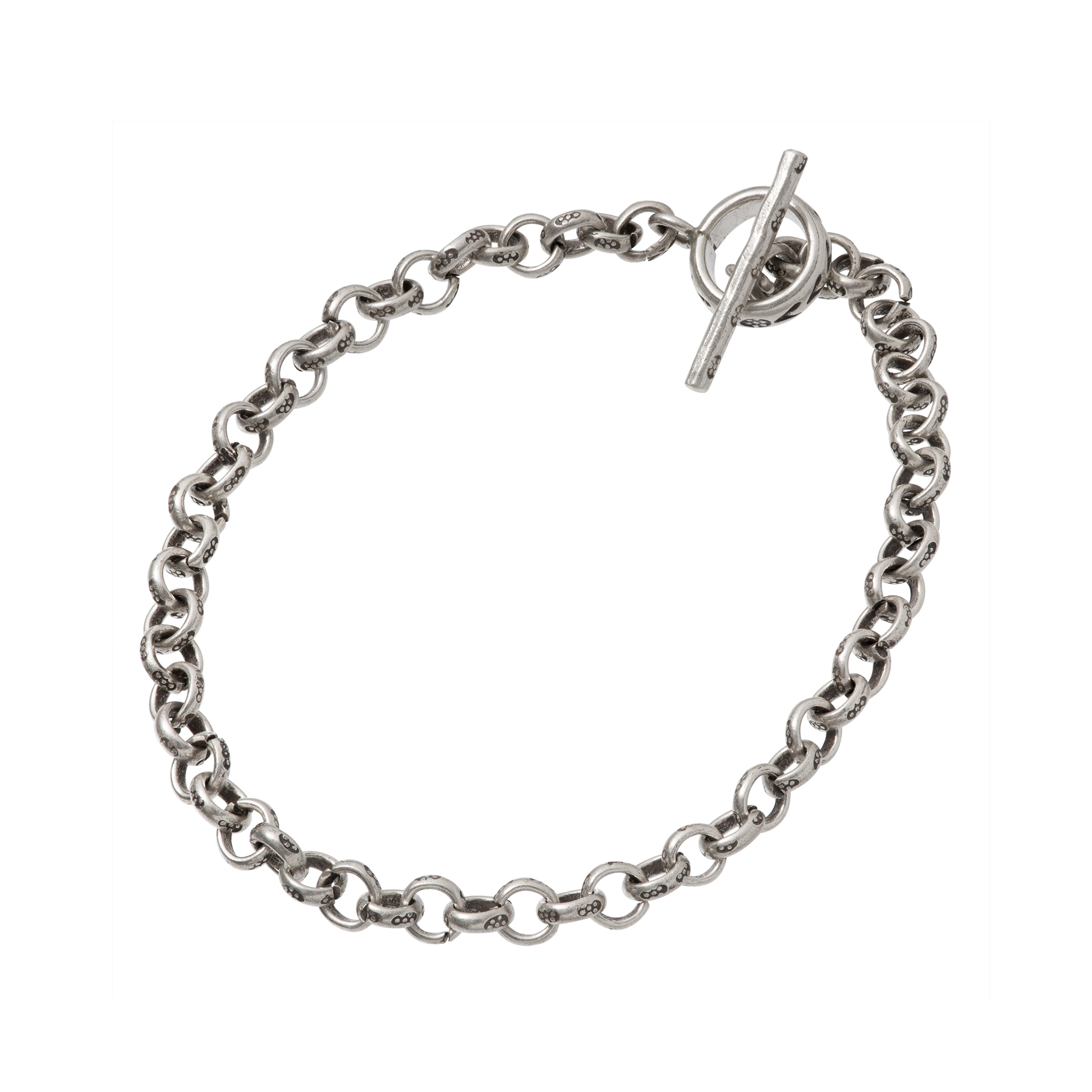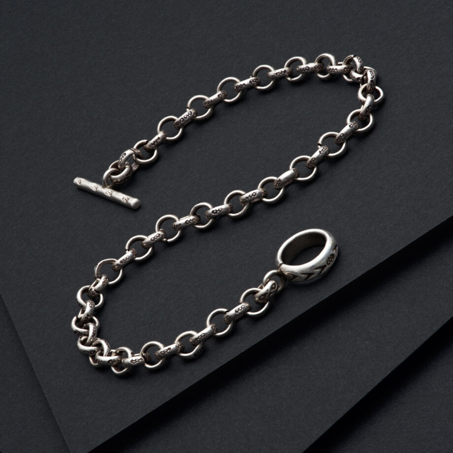 甲丸チェーンのコマひとつひとつに七曜文の刻印が打ち込まれたカレンシルバーのブレスレットです。