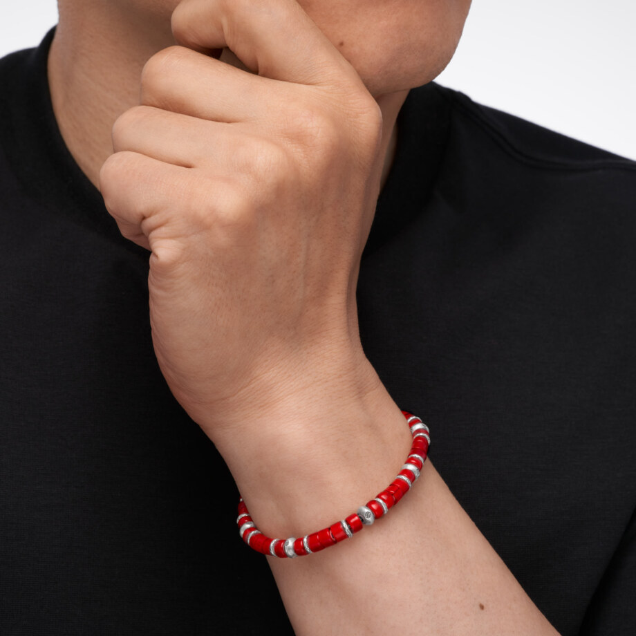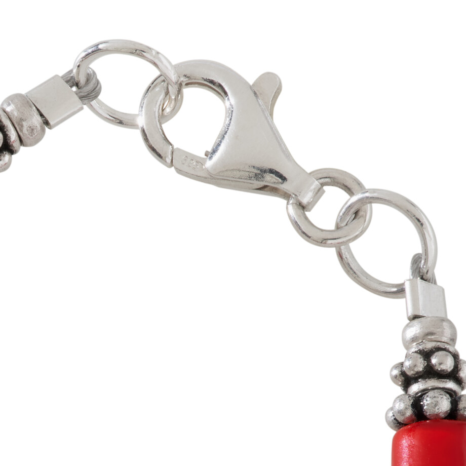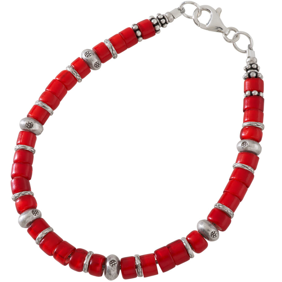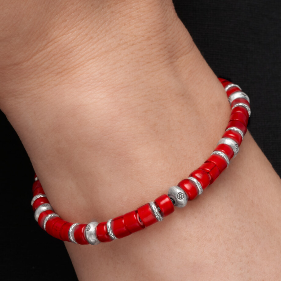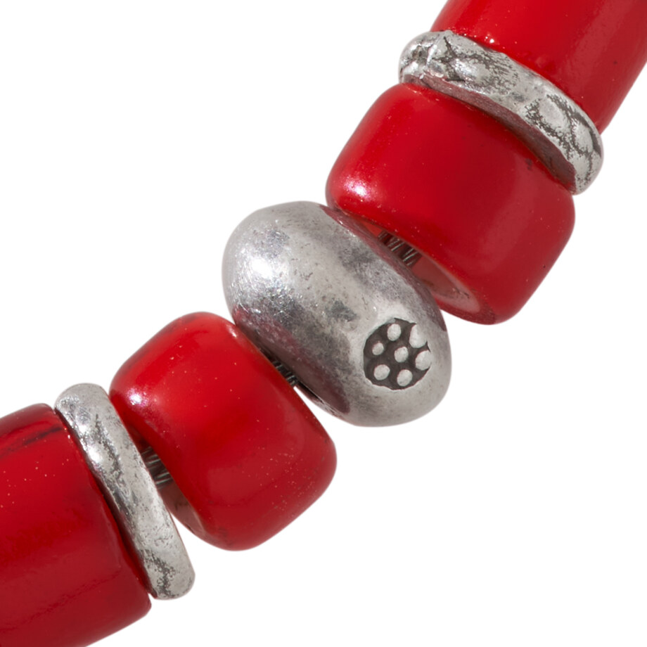 赤のアンティークビーズの間に、ひと回り大きなカレンシルバー玉をリズムよく配置したブレスレットです。