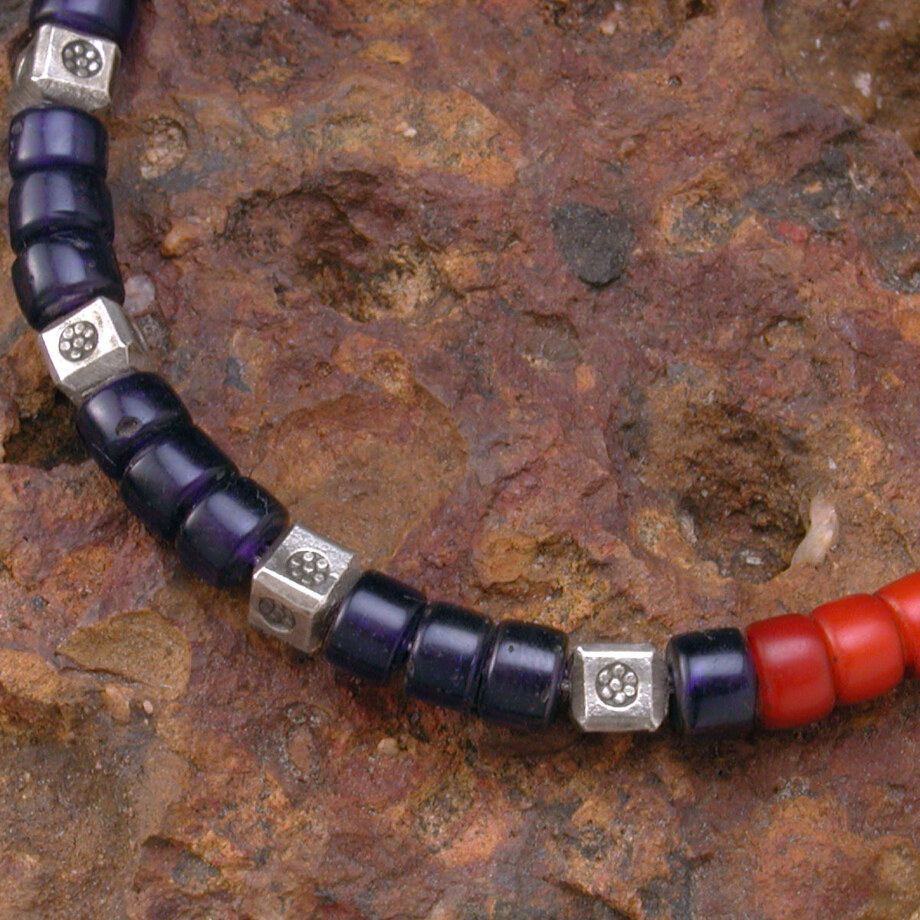 暗青色と赤のアンティークビーズはアカ族とナガ族の伝世品