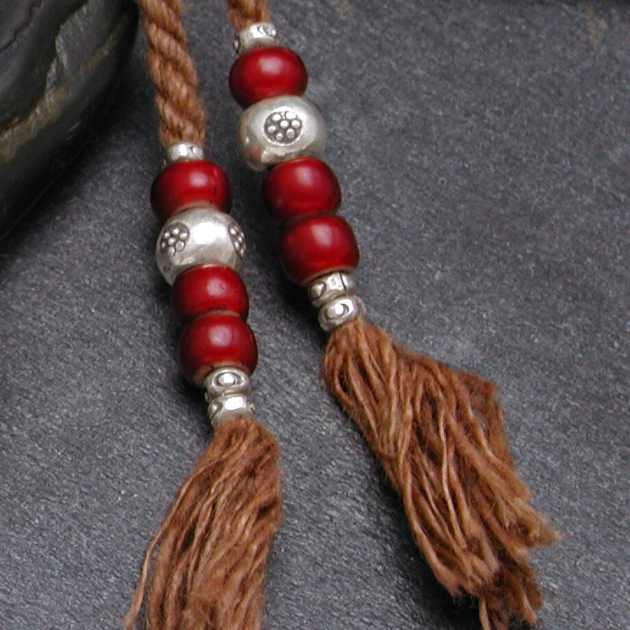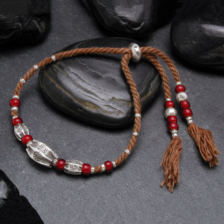 柿渋染の手紡ぎ木綿紐はどこか懐かしさを感じる純朴な色で、鈍色のカレンシルバーと濃紅色のアンティークビーズとの相性が良いブレスレットです。