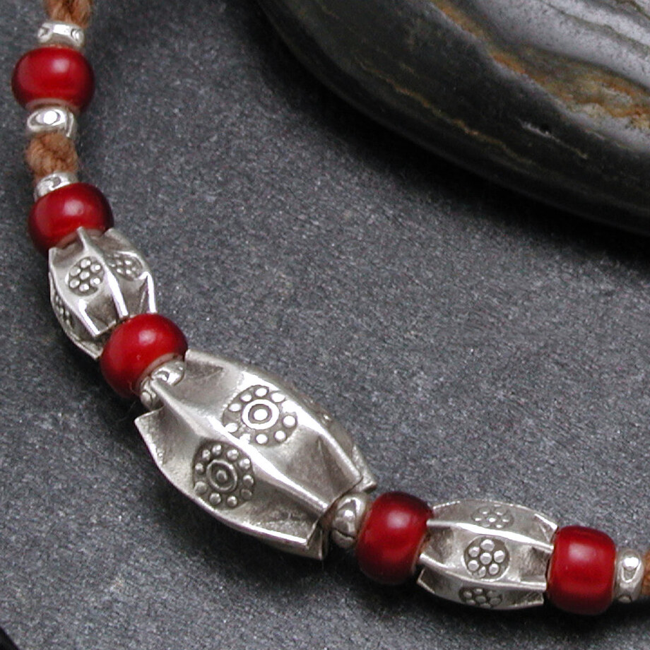 カレン族シルバー 魅了する赤 ホワイトハート アンティークビーズ 柿渋染手紡ぎ紐 ブレスレット アンクレット SV950 a05-55
