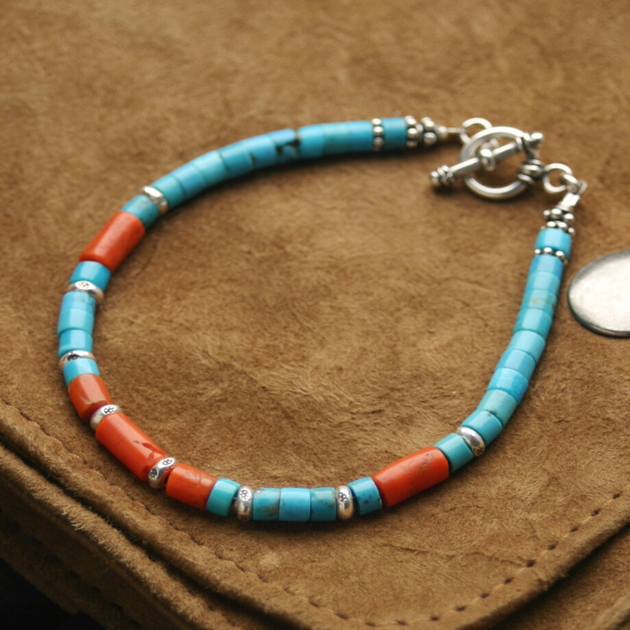 ターコイズと珊瑚でプエブロ族(北アメリカ)の伝統的装身具のパターンを表現したブレスレットです。