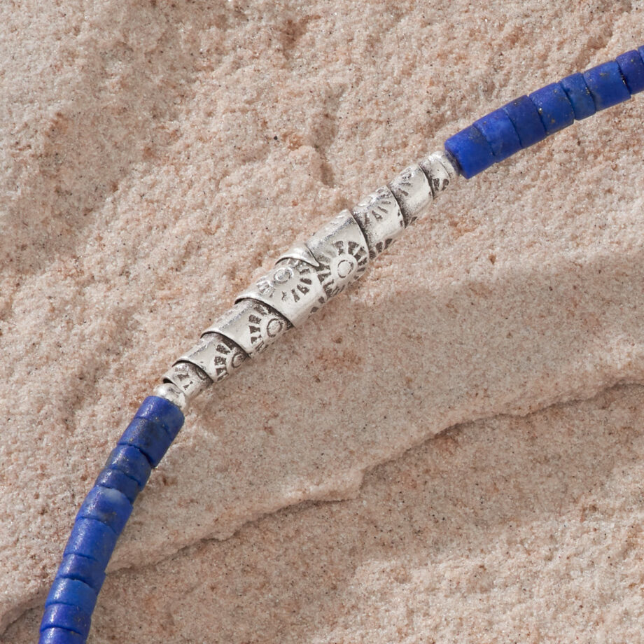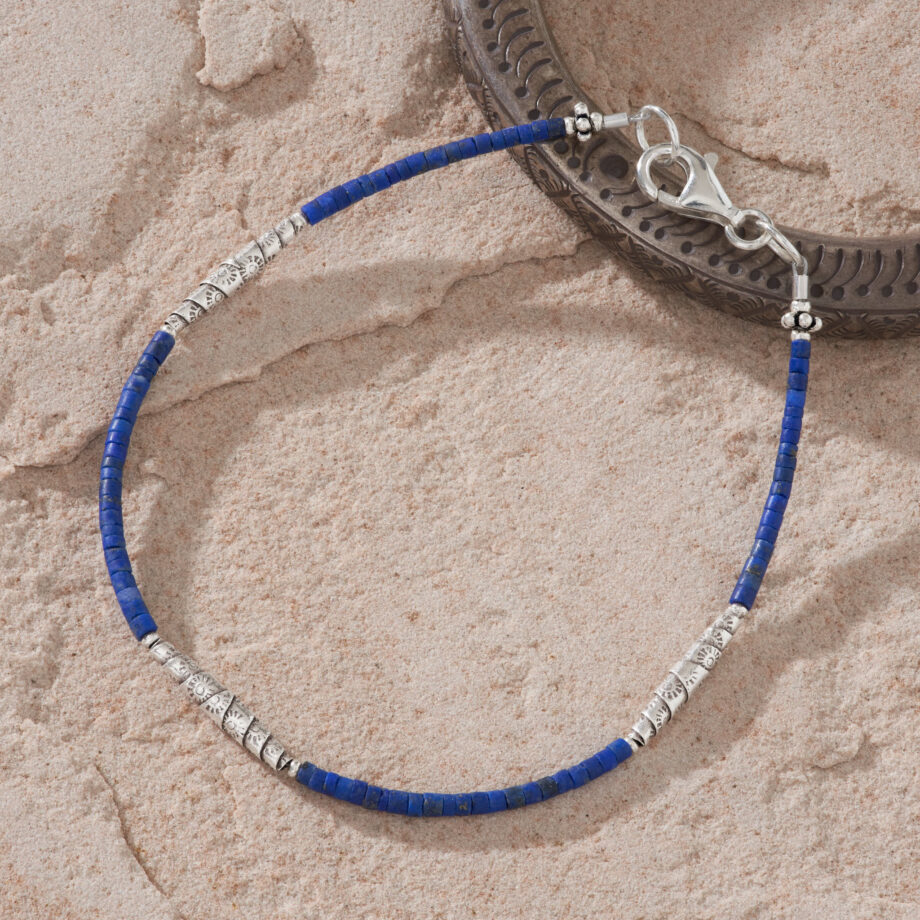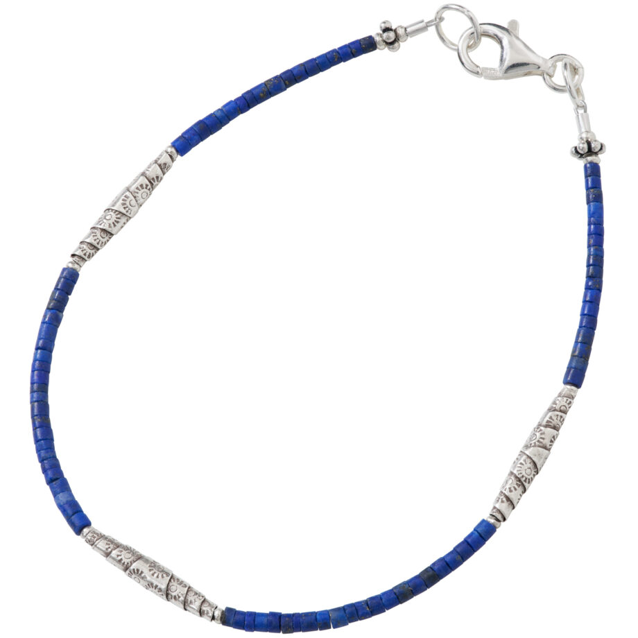 ユニークなクロワッサン形のカレンシルバービーズに目が留まるラピスラズリブレスレットです。