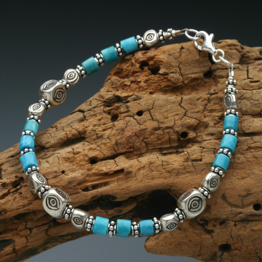 邪なものから身を守るシンボルとされた「眼」の刻印が、四方八方に目を光らせるターコイズブレスレットです。