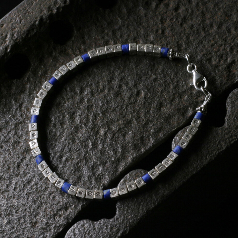 刻印を打ち込んだ立方体カレンシルバーとラピスラズリビーズをリズムよく配置したブレスレットです。