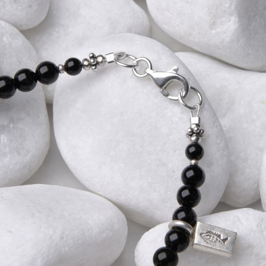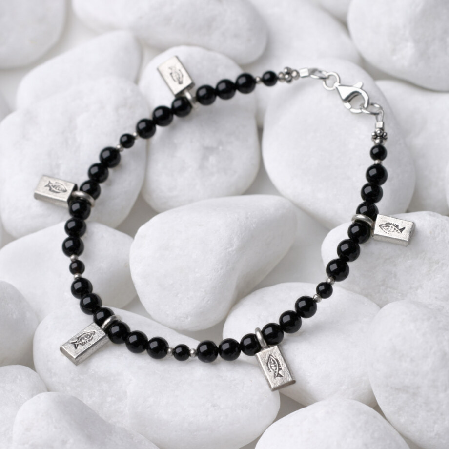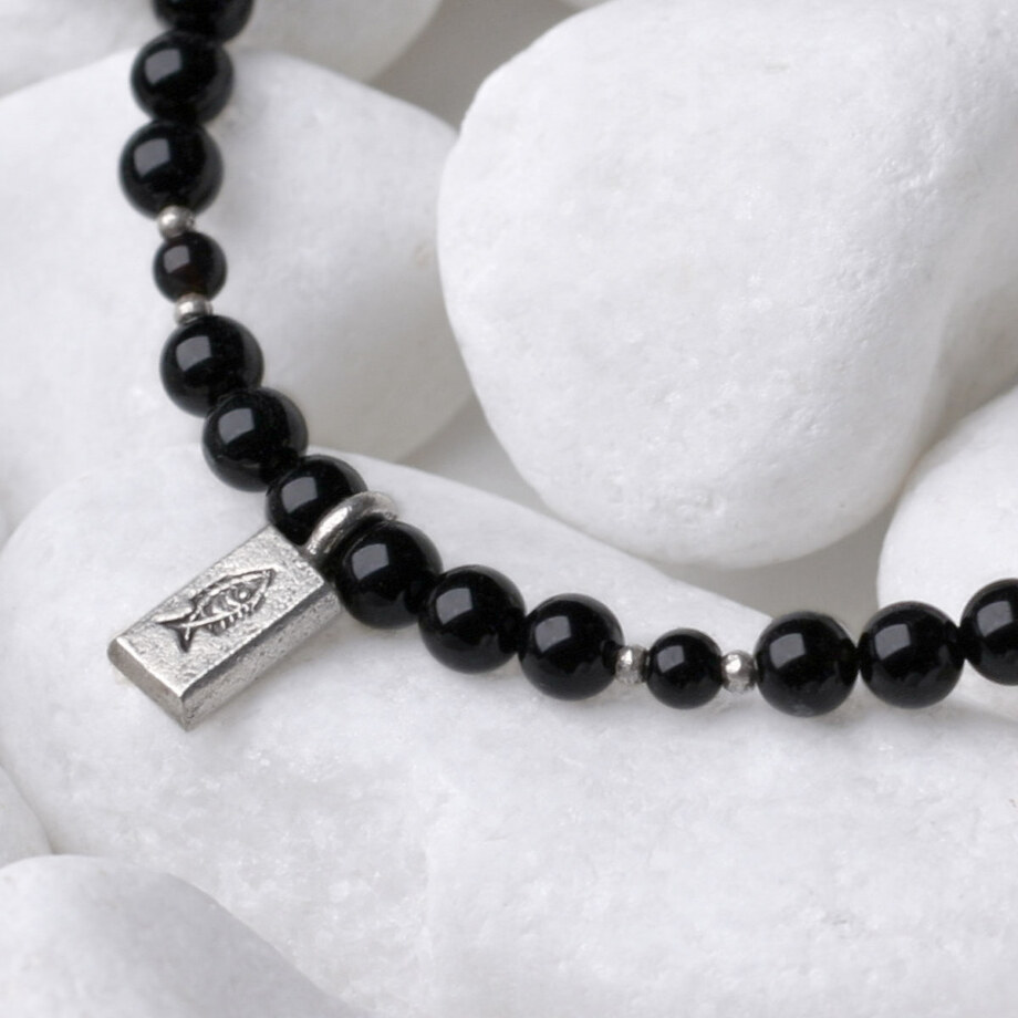 漆黒のブラックオニキスの間に、象形化した魚の刻印のカレンシルバーチャームを等間隔で配置したブレスレットです。