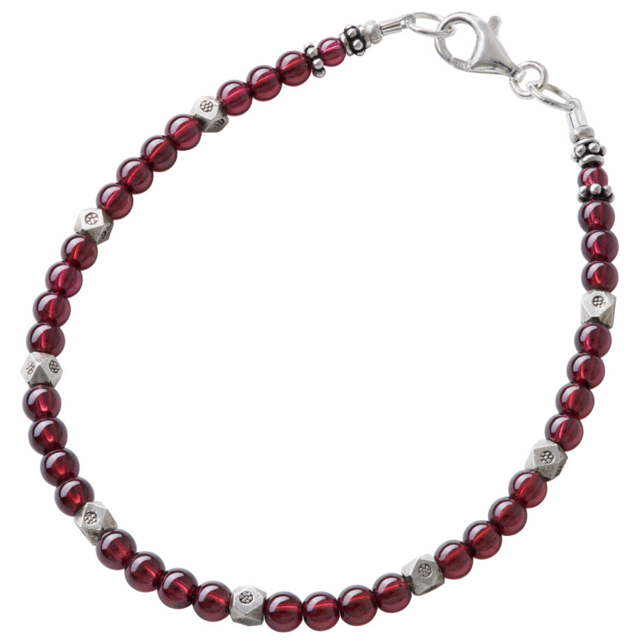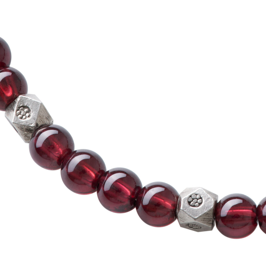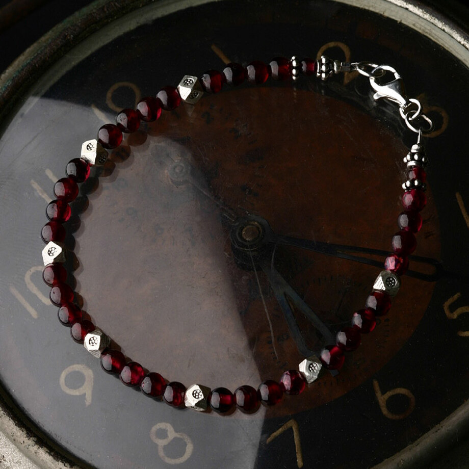 連なる深紅のガーネットに、角を削り落とした立方体カレンシルバーをリズムよく配置したシンプルなブレスレットです。