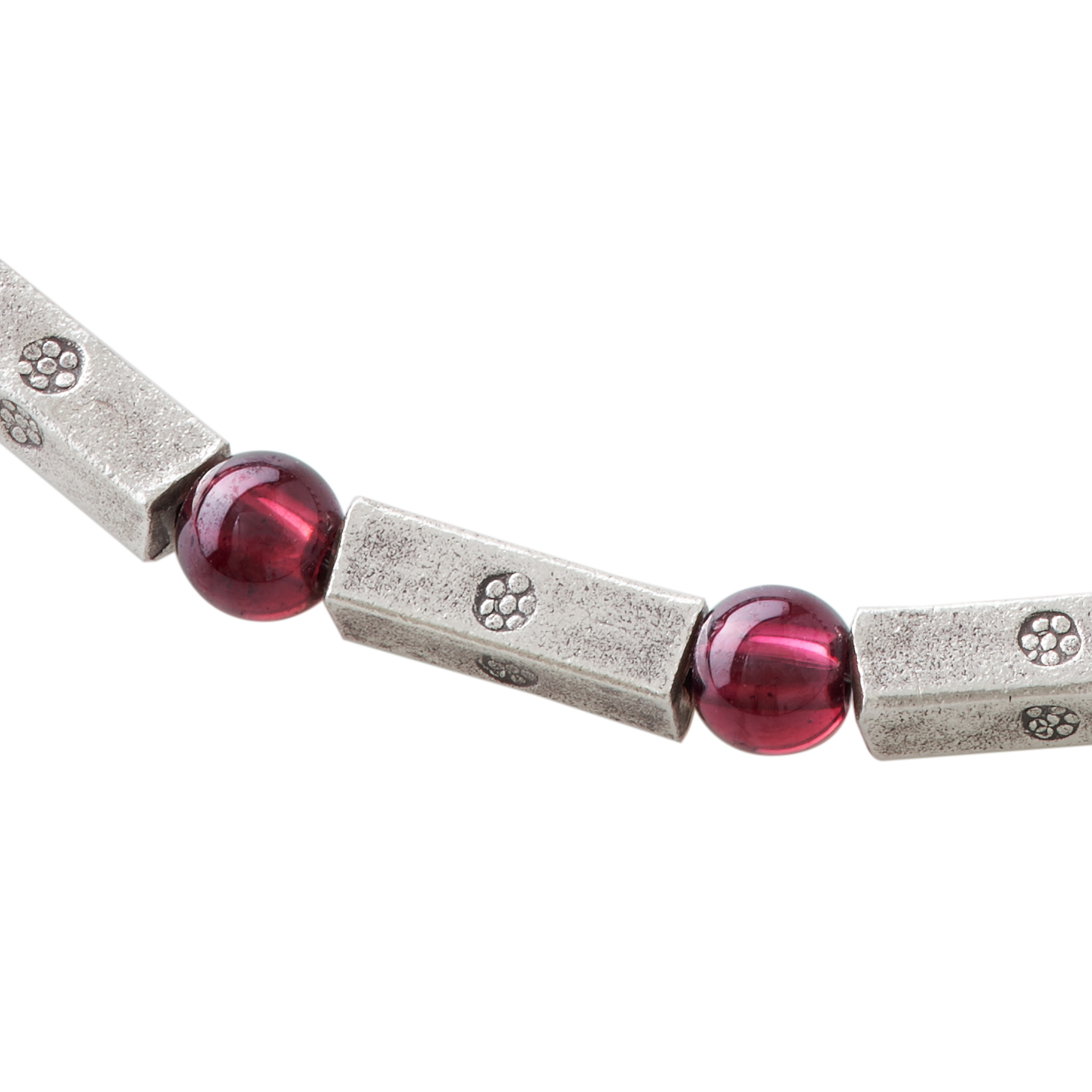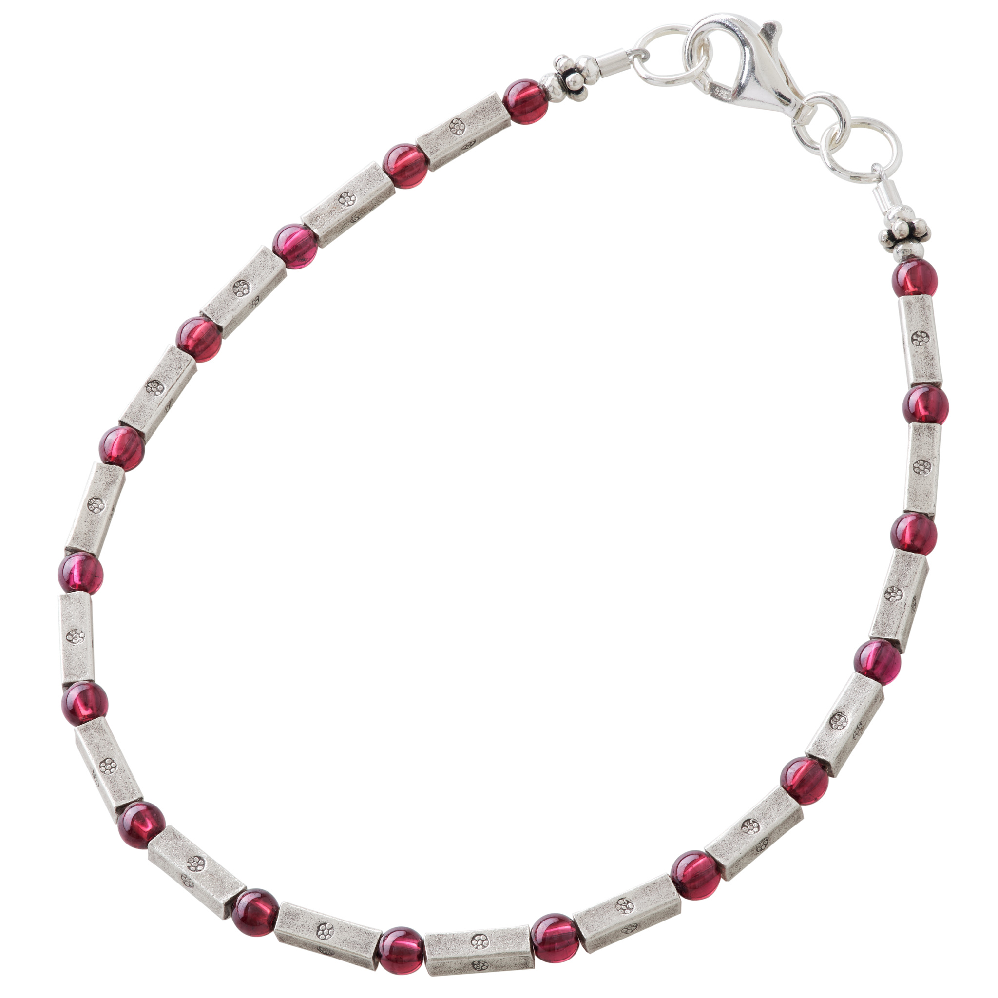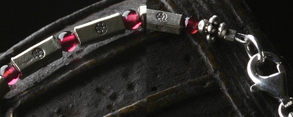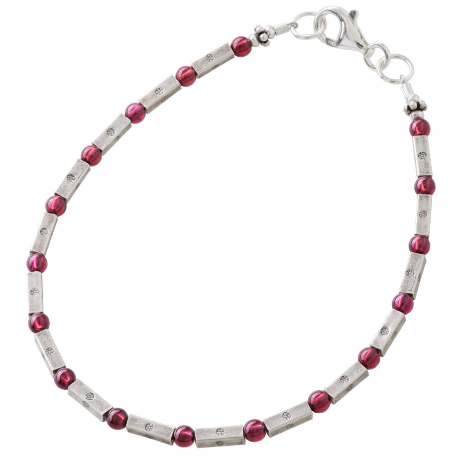 直方体で細身のカレンシルバービーズと深紅に輝くガーネットが交互に繰り返すブレスレットです。