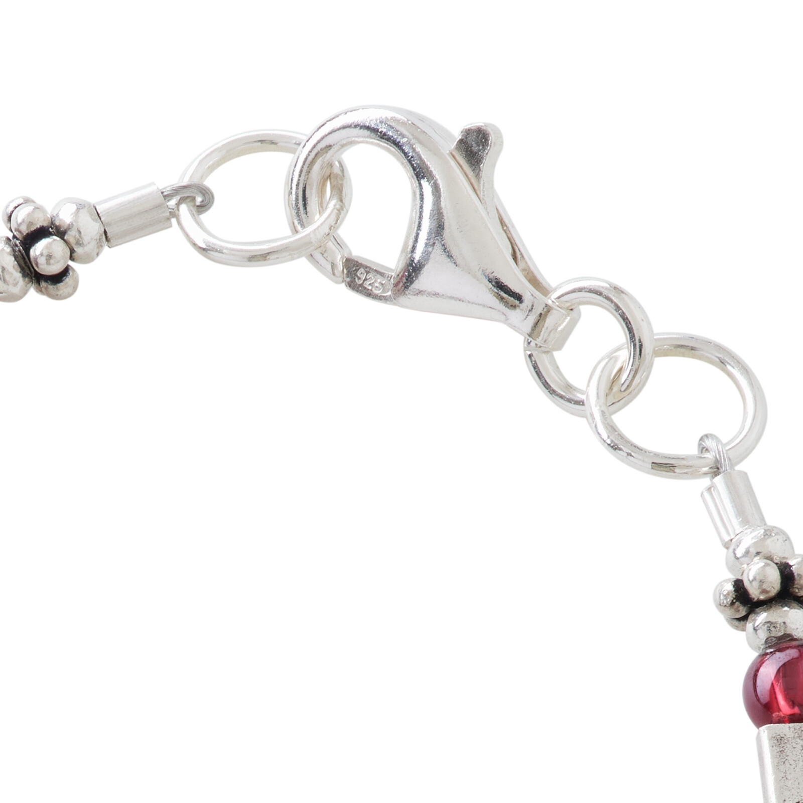 | 素材 | シルバービーズ SV950(銀純度95%)/タイ製 留め具 SV925/イタリア製 ストッパー SV940/アメリカ製 ステンレスワイヤー/日本製 ガーネット/インド |
