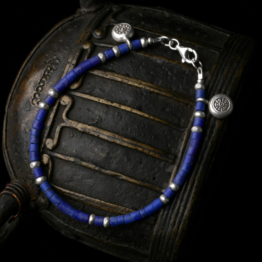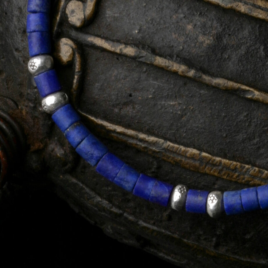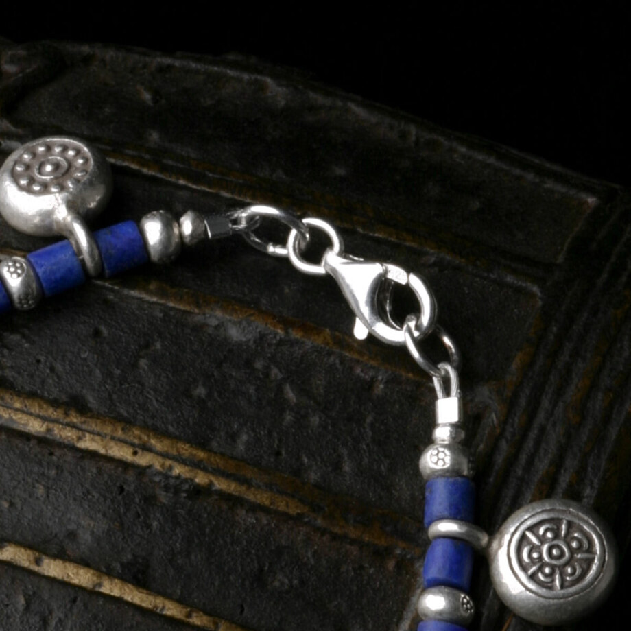 カレン族シルバー フェルメールを虜にした青 ラピスラズリ ビーズ ブレスレット アンクレット 2つの異なるチャーム SV950 a06-44