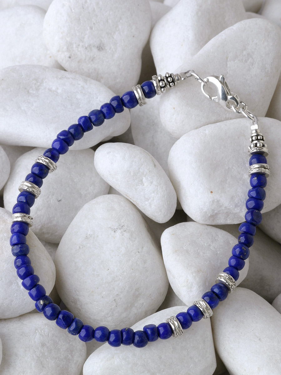 あいだに薄い円盤形カレンシルバービーズを挟むことで、コントラストが強調され、深い紺碧色がいっそう美しく引き立ちます。