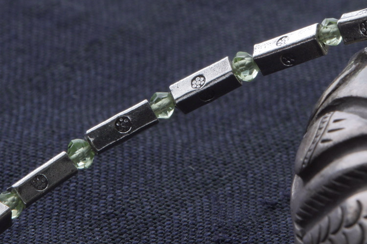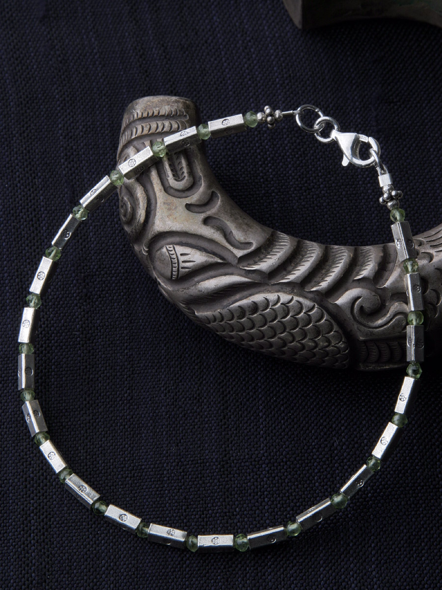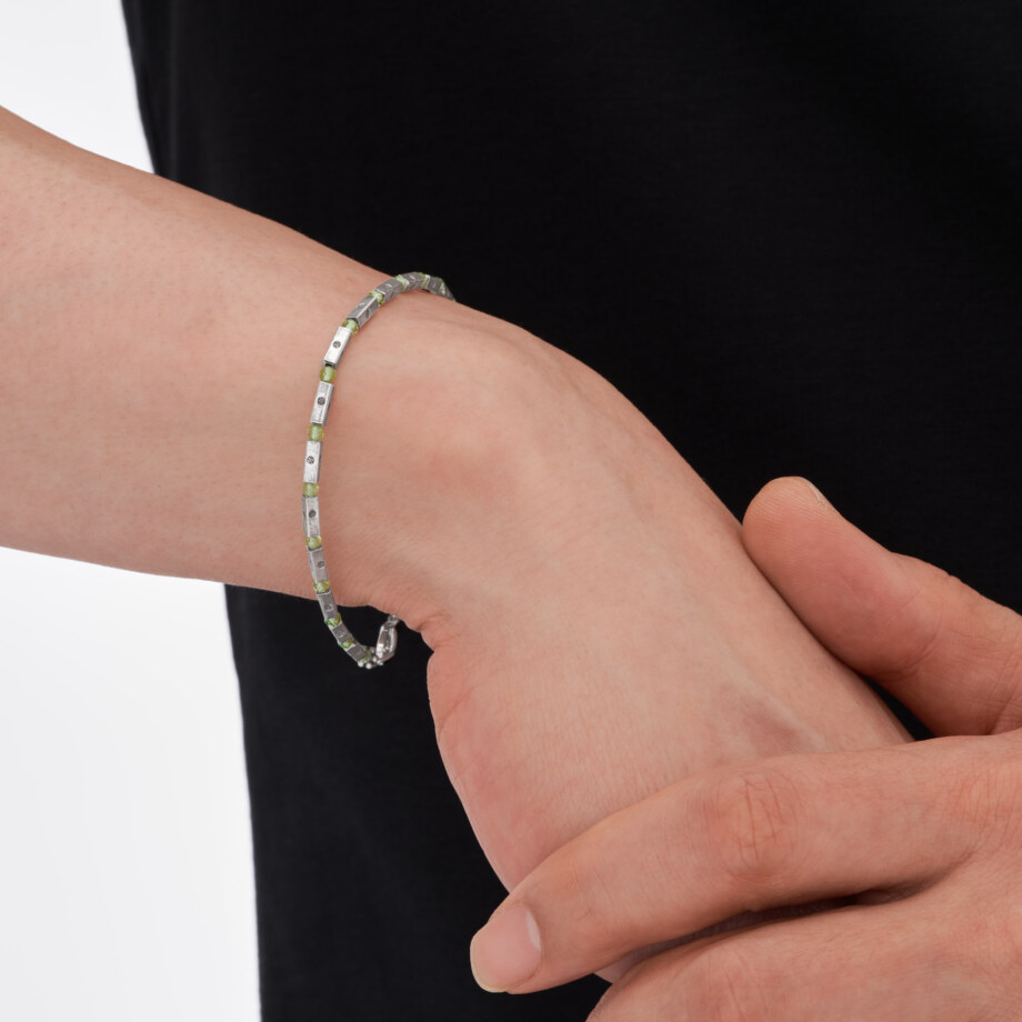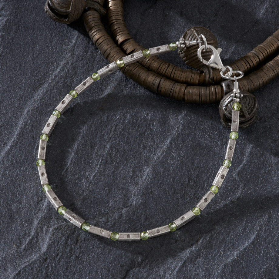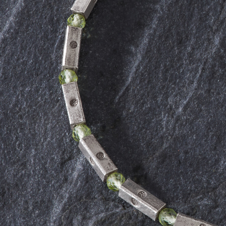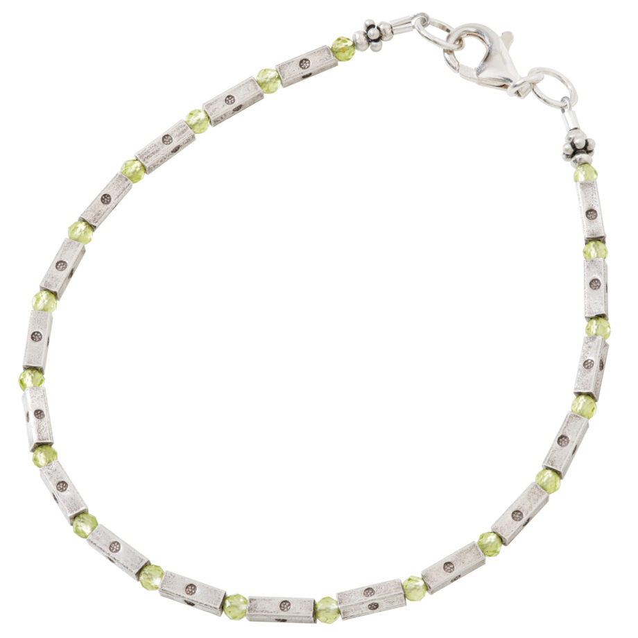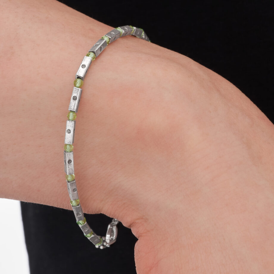 直方体で細身のカレンシルバービーズと小粒のペリドットが交互に繰り返すブレスレットです。